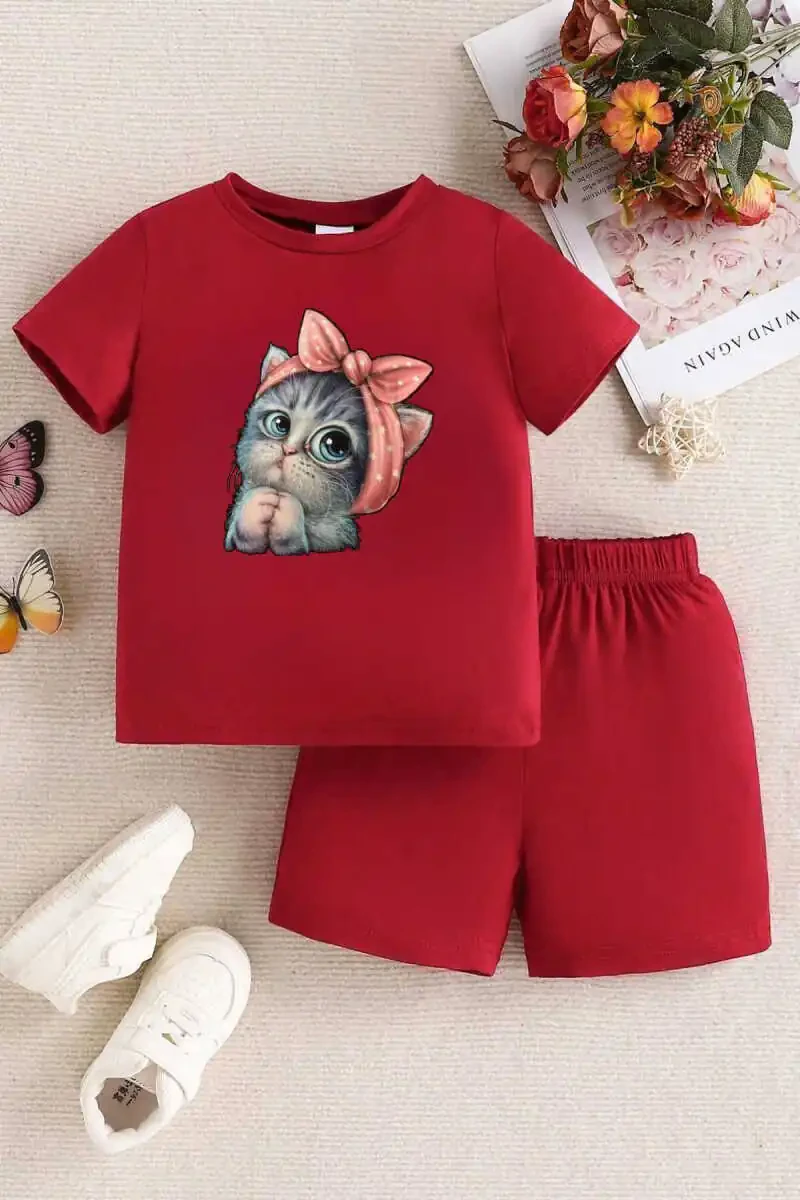 bolalar shorti to'plami, bolalar t-shirt, yozgi kiyim, velosiped yoqasi, mushukli bosma, qizil, shorti, t-shirt, bolalar kiyimlari, yoz