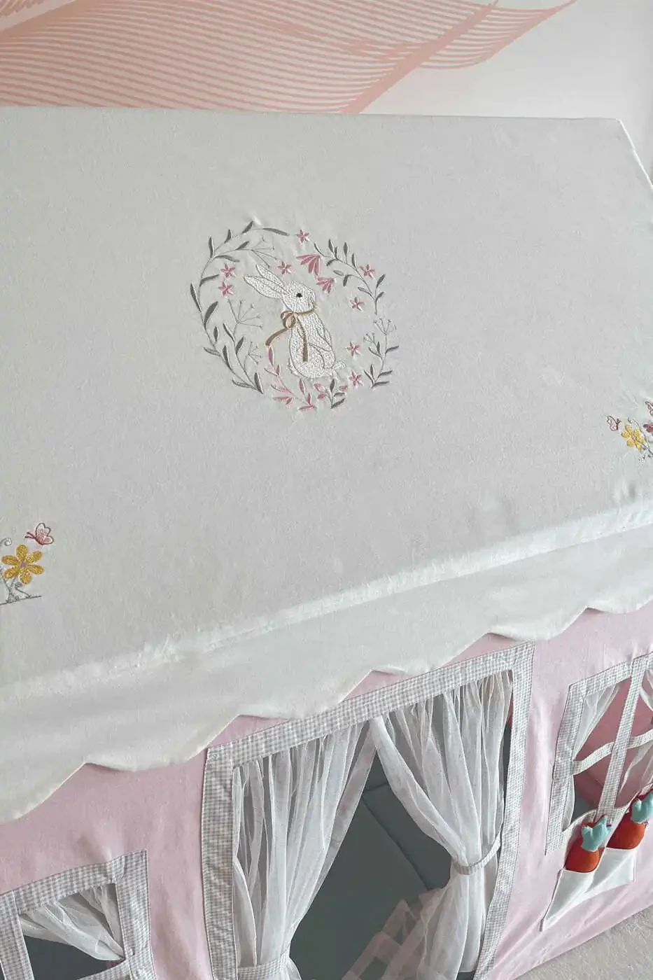Meet the Rabbit Patterned Play Tent, which will color your children's imagination and offer them a safe and fun playground! This cute playhouse allows your children to develop their creativity, have fun with their friends, and create their own special worlds. This play tent decorated with rabbit patterns will become an indispensable part of children's rooms, playrooms or gardens. This product, offered with Pastelya Kids quality, is produced by prioritizing the health and safety of your children. Our product offers long-lasting use with its durable aluminum frame system and 100% cotton fabric cover. The floor cushion, specially designed for your children to be comfortable while playing, is also included in the product. This cushion offers a hygienic and comfortable play experience with its 1st quality antibacterial fiber filling and oeko-tex certified fabric. Our play tent is shipped disassembled and can be easily installed. You can complete the installation in minutes with the tool-free plug-in logic, and you can move the playhouse to different locations whenever you want. Thanks to its lightweight structure, you can easily move your playhouse from room to room, or even to the park or garden. In this way, your children can have their own playgrounds anytime and anywhere. Our play tent is not only a fun playground, but also contributes to the development of your children. It supports them to use their creativity, improve their problem-solving skills and increase their social interactions. With its rabbit patterned design, it stimulates children's imagination and offers them the opportunity to create their own fairy tales. Our play tent is manufactured in accordance with all safety standards. It does not contain any substances harmful to health and all necessary precautions have been taken for the safety of your children. In this way, you can ensure that your children play with peace of mind. Our product comes with a stylish carrying case. Thanks to this case, you can easily store and transport your play tent wherever you want. Our play tent will be an unforgettable gift option for your children. It offers them the opportunity to create their own special worlds and realize their dreams. This fun and educational playground contributes to the development of your children while at the same time offering them the opportunity to collect pleasant and happy memories. Make your children's playtime more fun and meaningful with the Rabbit Patterned Play Tent!