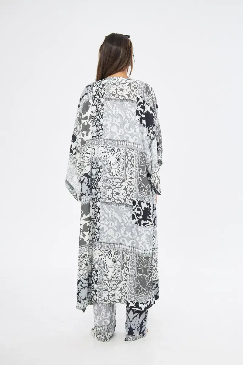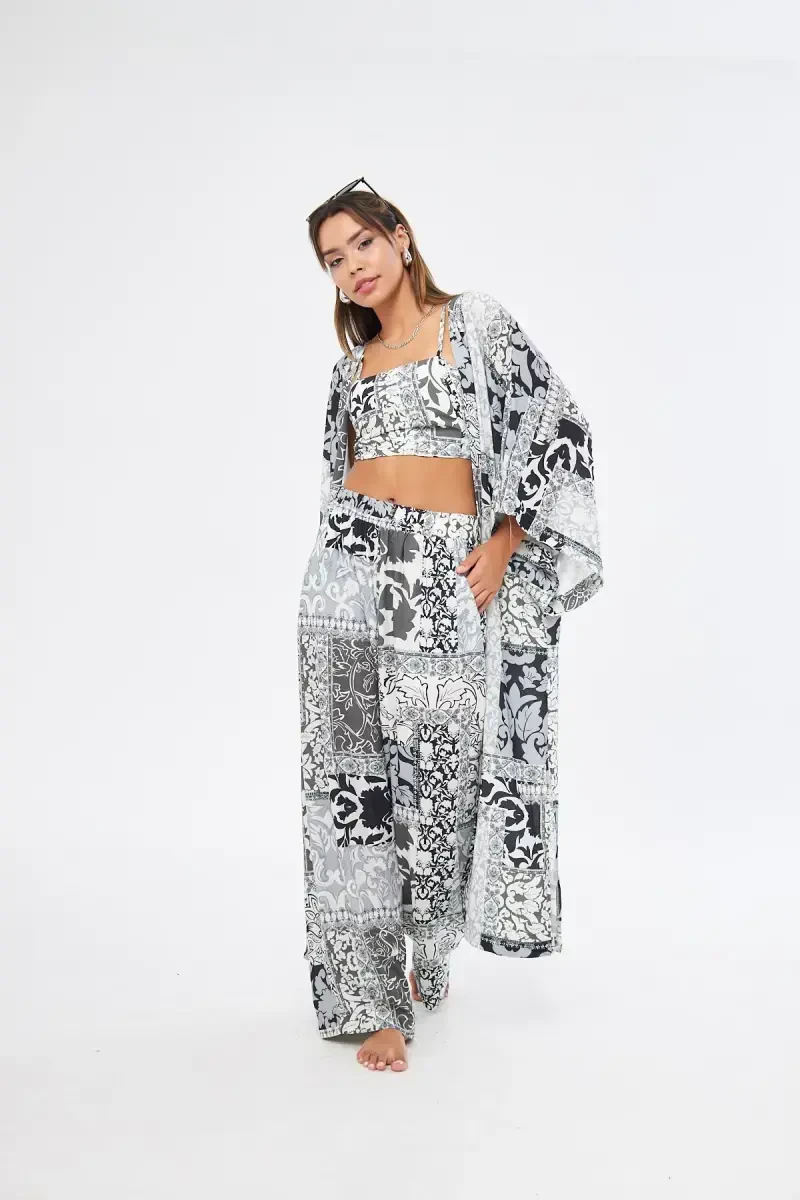 Experience elegance and comfort with the Kimono 3-Piece Bustier Black Patterned Set (MEDINA SILK)-BLACK PATTERNED, carefully designed by THE CHAMP CLOTHING. This special design gently wraps your skin with the unique texture of Medina silk, while its modern cut offers a dazzling look. This set, which you can choose for a special occasion or for daily use, is a candidate to be an indispensable part of your wardrobe. Moreover, hurry to own this special product offered at a campaign price! Do not miss this opportunity limited to stocks. Although our product may be offered by different sellers, THE CHAMP CLOTHING prioritizes your quality and satisfaction with its assurance. Remember that each seller's price, score, delivery conditions and additional advantages offered may differ. Therefore, it is important to consider all these factors when making your choice. You can order a maximum of 10 of our products. Trendyol reserves the right to cancel the order for your requests for more quantities. Please contact us for your corporate orders and let us inform you about special limits. Your satisfaction is important to us! Therefore, if you do not like the product, you can benefit from the free return option within 15 days. You can visit the relevant page for detailed information about return conditions. Our Elegant and Luxurious Kimono Style 3-Piece Bustier Set is designed with the lightness and elegance of Medina silk. The kimono cut blouse highlights your elegance with its bustier detail, while its long sleeves and soft texture provide all-day comfort. The wide-leg trousers, made of the same quality Medina silk, do not restrict your freedom of movement with their high-waisted design and comfortable cut. The bustier, which is the complement of the team, can also be used separately, allowing you to create different combinations. Show off your elegance with high heels at special occasions or with sandals for daily use. Our product appeals to every taste with its different color options, and reaches a wide range of users with S, M and L sizes. In order to use this special set made of Medina silk fabric for many years, it is important to wash it by hand or on a gentle machine wash and follow the care instructions. Please note that the product images are representative and the actual color tones may differ.
