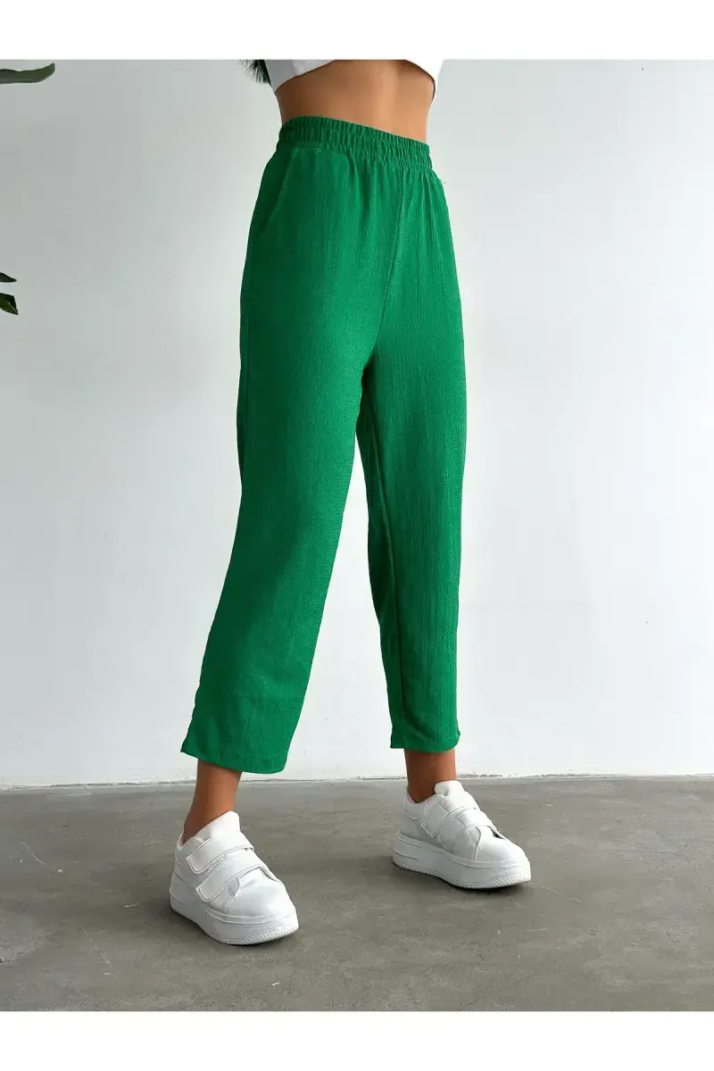Bring a breath of fresh air to your wardrobe with the Kimono Seersucker Suit. Experience all-day comfort thanks to the lightness and breathability of the high-quality seersucker fabric. This suit is ready to accompany you in every moment by offering both elegance and comfort together. The kimono-style top creates a modern and elegant silhouette, while the wide-leg trousers complete your elegance without restricting your freedom of movement. Attract attention with its vibrant and refreshing green color. Whether for daily use or special invitations, this suit is designed to suit any environment. It is an ideal choice for achieving a stylish look in the office, having a pleasant brunch with friends, or attending a special dinner. The Kimono Seersucker Suit is not just a piece of clothing, but also an expression of a lifestyle. It allows you to feel free and stylish. Enjoy being stylish without sacrificing your comfort with this suit, and make a difference in every environment you enter. The natural wrinkled appearance of the seersucker fabric adds a special touch to the suit, while its non-iron structure offers practical use. This suit, which will be an indispensable part of your wardrobe, will accompany you for many years with its timeless design. Take your style to the next level with the Kimono Seersucker Suit, where you will feel the quality and care in every detail. Remember, elegance is not just a look, but also an attitude. Reflect both your appearance and your self-confidence with this suit. Thanks to its all-season wearability, you can enjoy this elegance every day of the year. Create your own style by combining it alone or with different accessories. The Kimono Seersucker Suit offers unlimited combination possibilities, allowing you to always look different and unique. With this suit, which is a must-have in your wardrobe, experience both elegance and comfort in every moment.