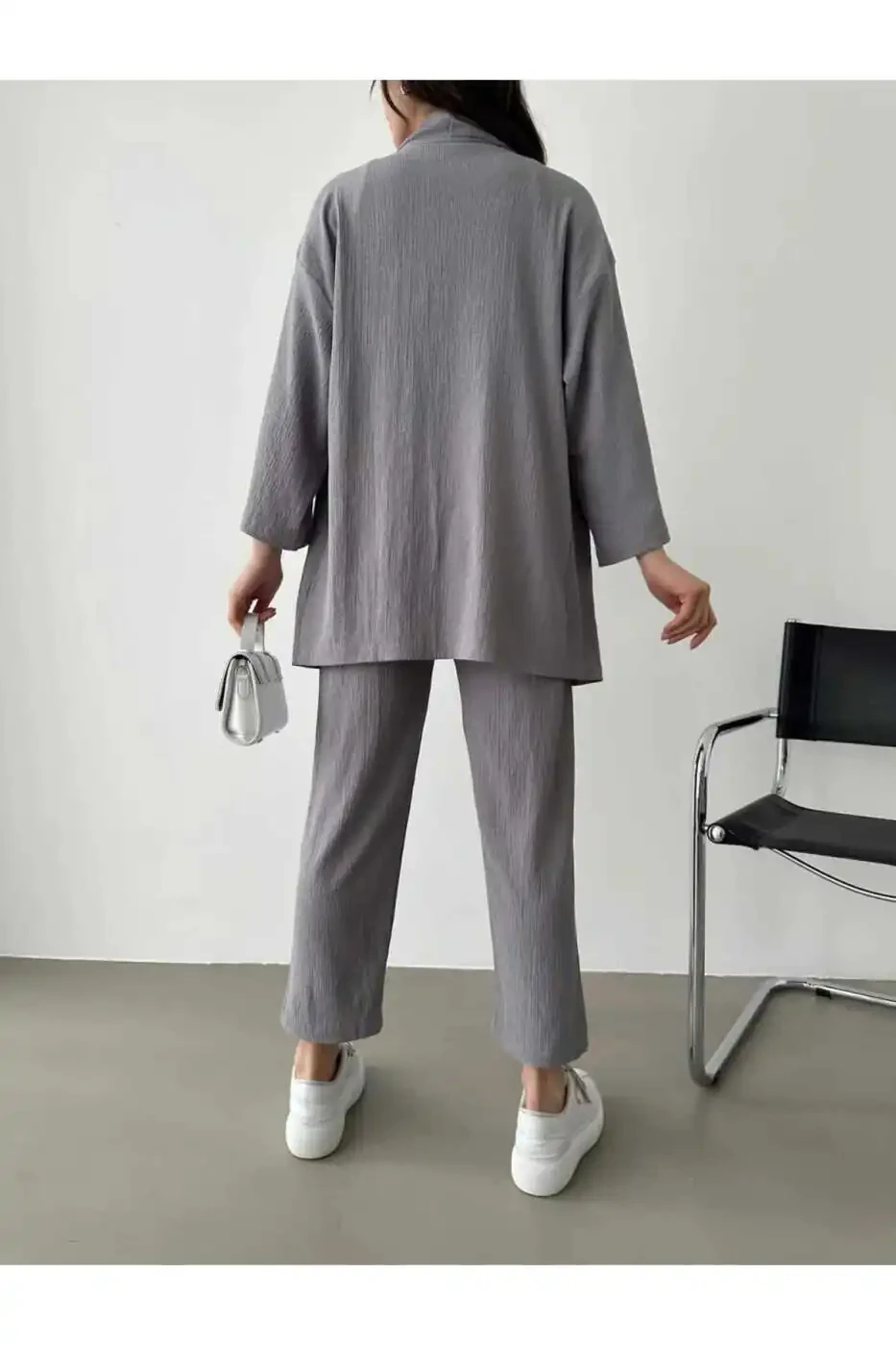 The set consists of a stylish kimono jacket and comfortable jumpsuit pants. The jacket creates an elegant silhouette with a belt detail that ties at the waist, while the wide legs of the jumpsuit pants allow you to move freely.
