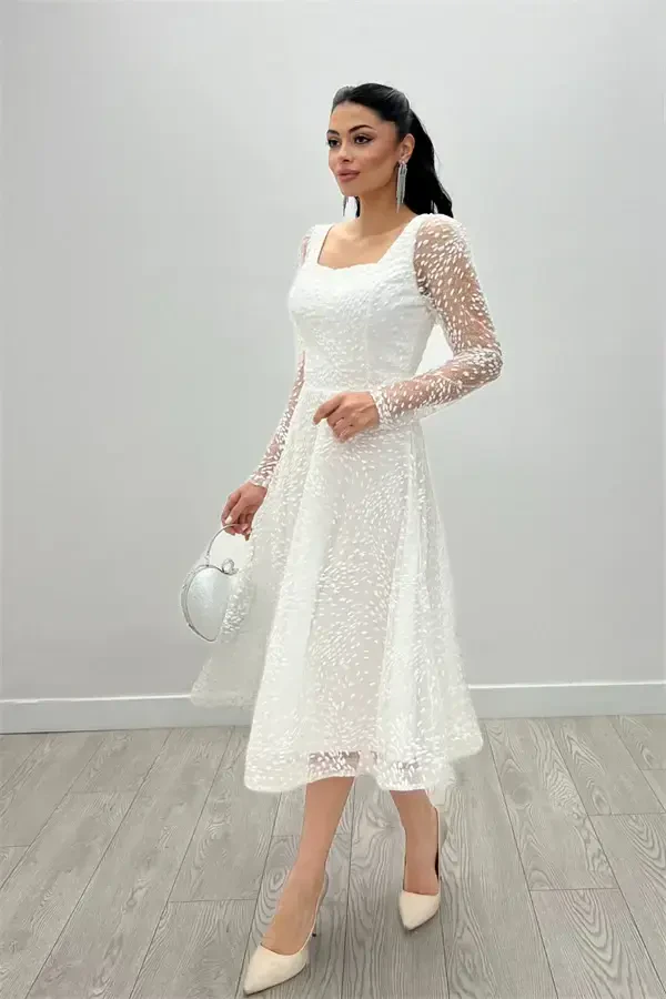 Gazlama tilla qoplamali kvadrat yaka midi oqshom kiyim | Nafis va jozibali
