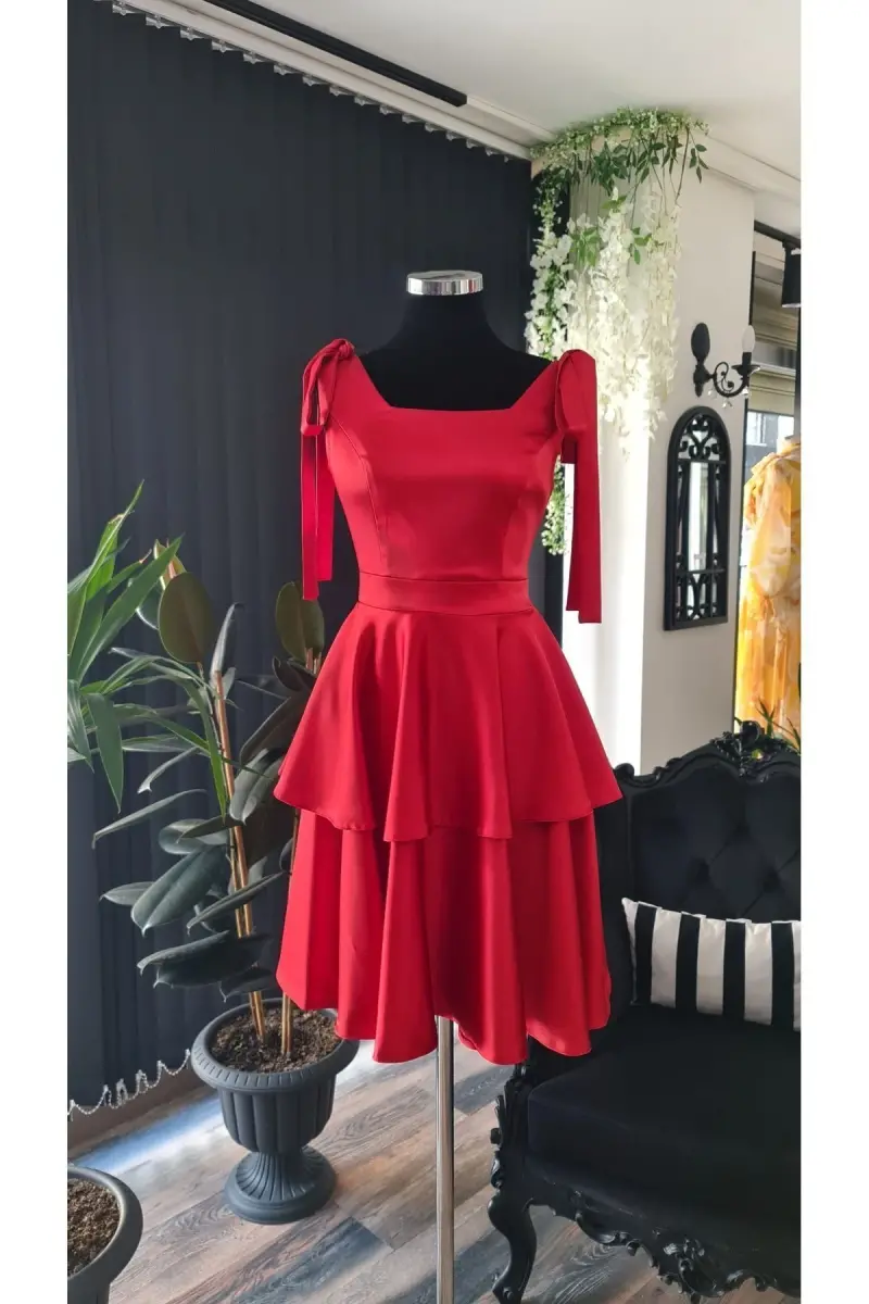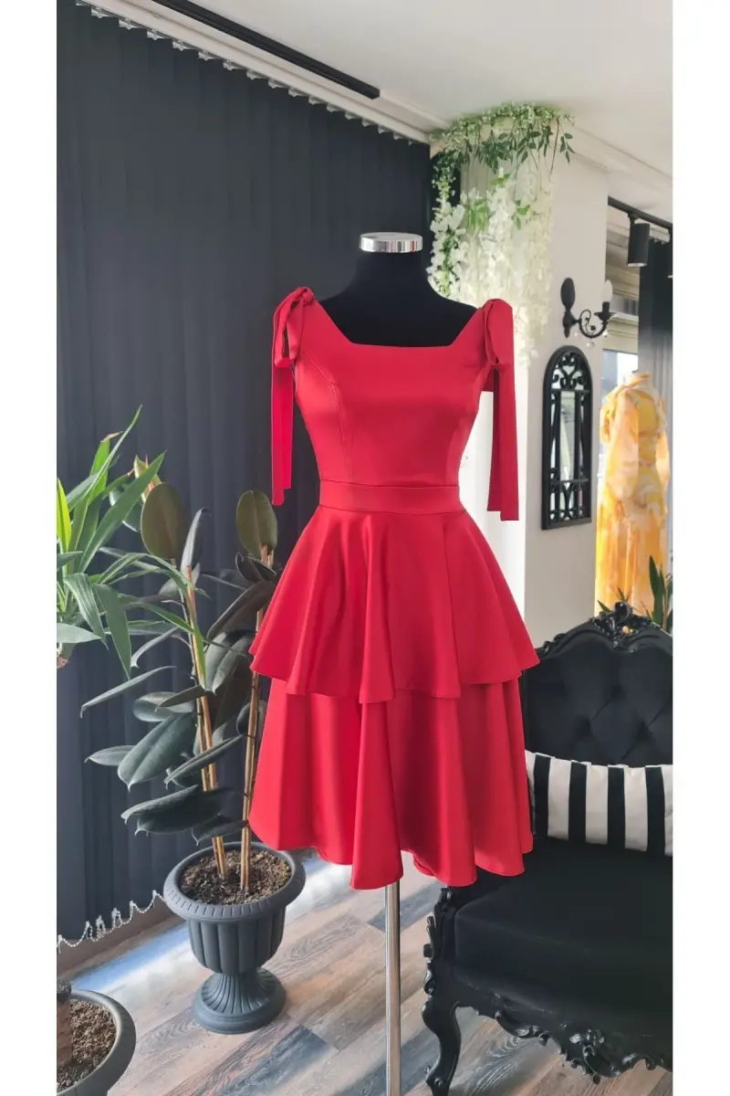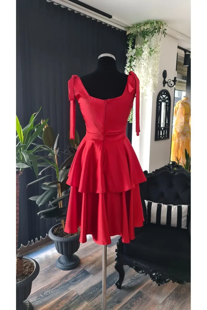 Kırmızı Saten Kare Yaka ,kolsuz,omuzları Fiyonklu Mezuniyet Elbisesi-kırmızı