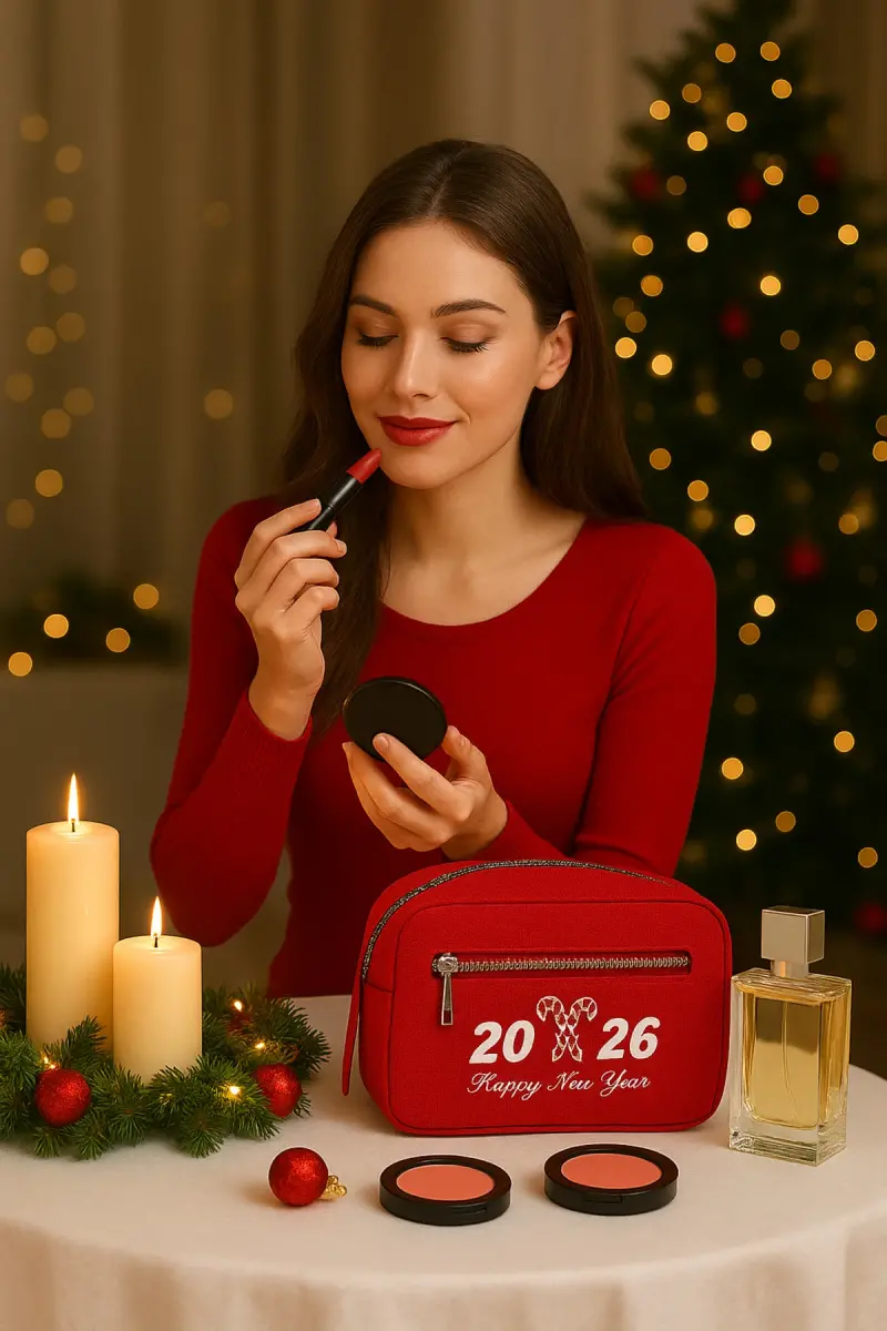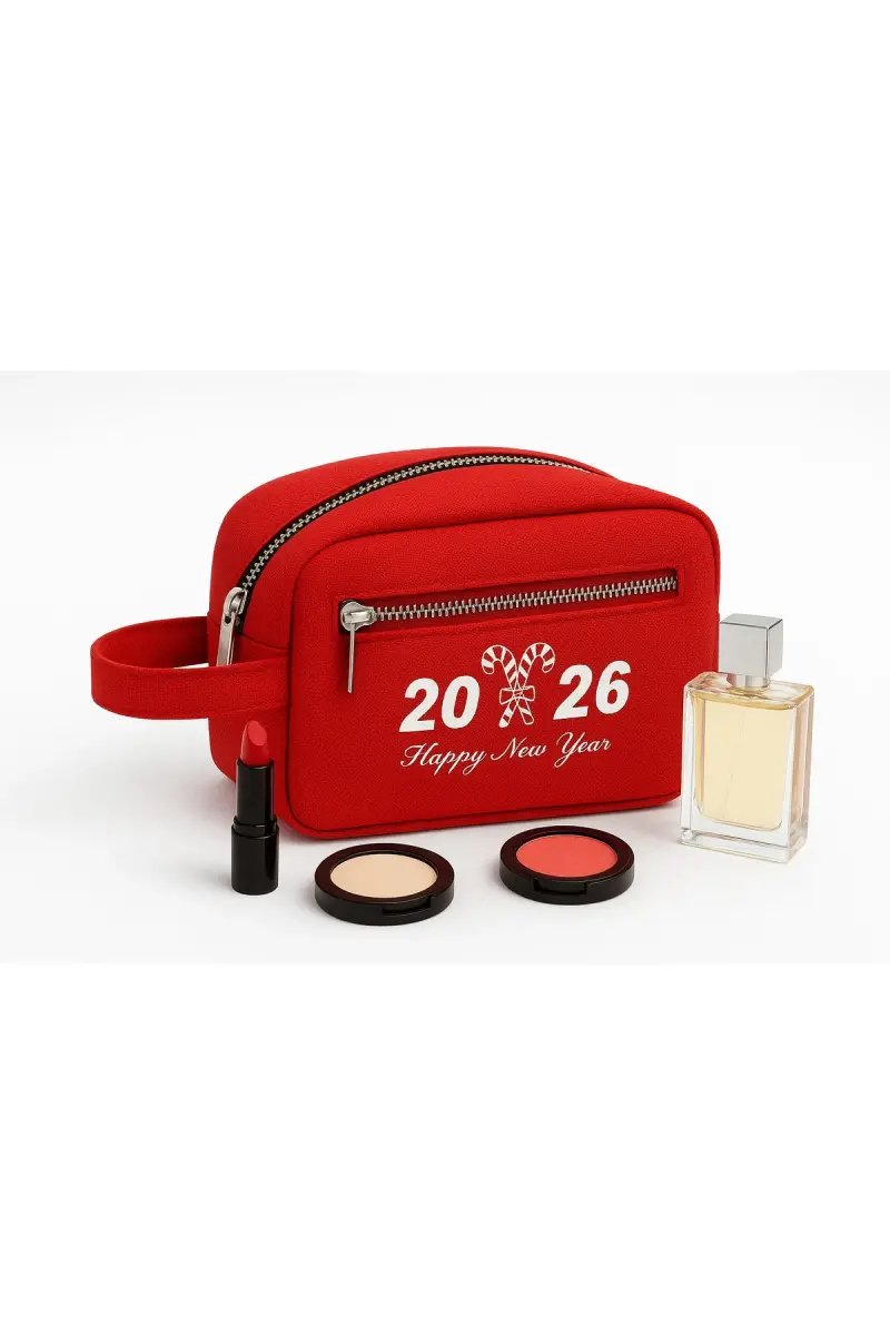 Kırmızı Yılbaşı Temalı Makyaj Çantası – Seyahat ve Kozmetik Organizer – Hediyelik Kadın Çantası-Kırmızı