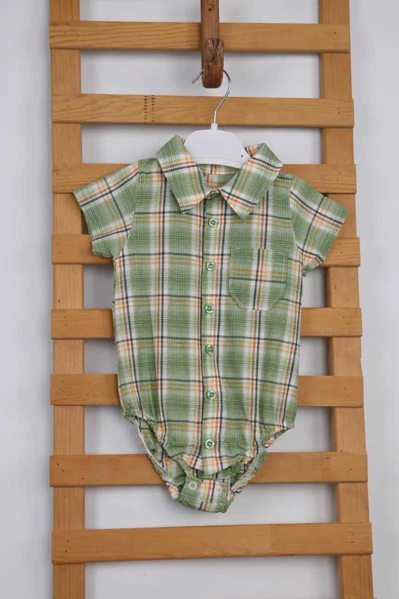 Kısa Kol Poplin Kumaş Erkek Bebek Ekose Gömlek Badi 3503s-Yeşil