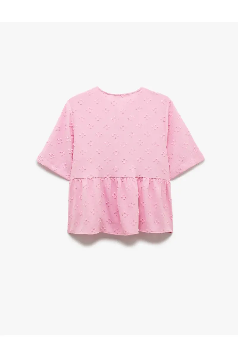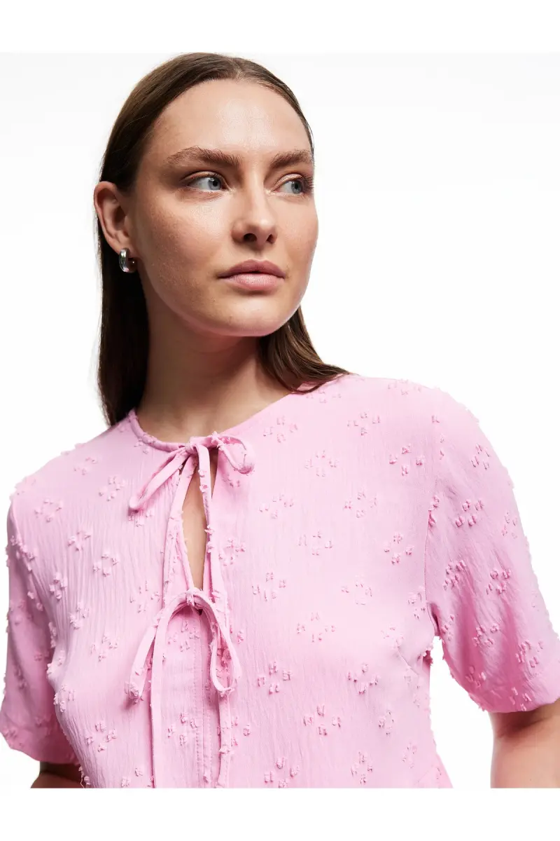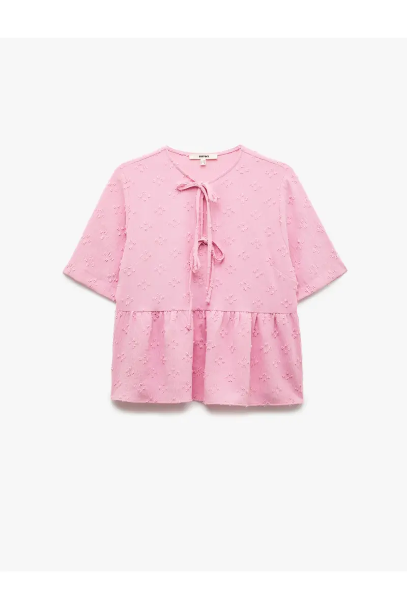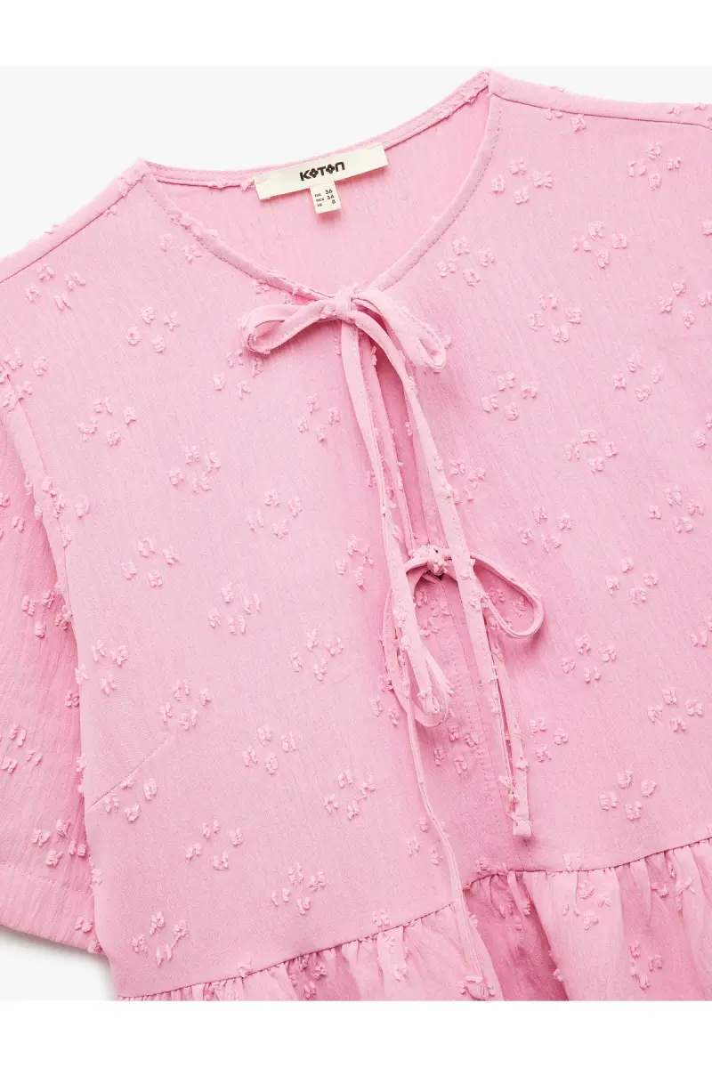Kısa Kollu Fiyonk Detaylı Dokulu Önden Bağlamalı Bluz-Gül