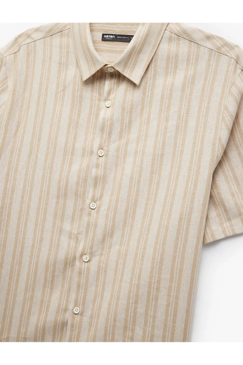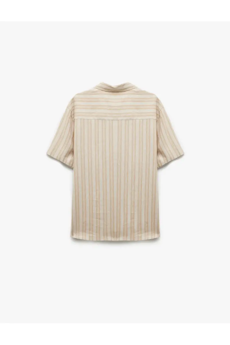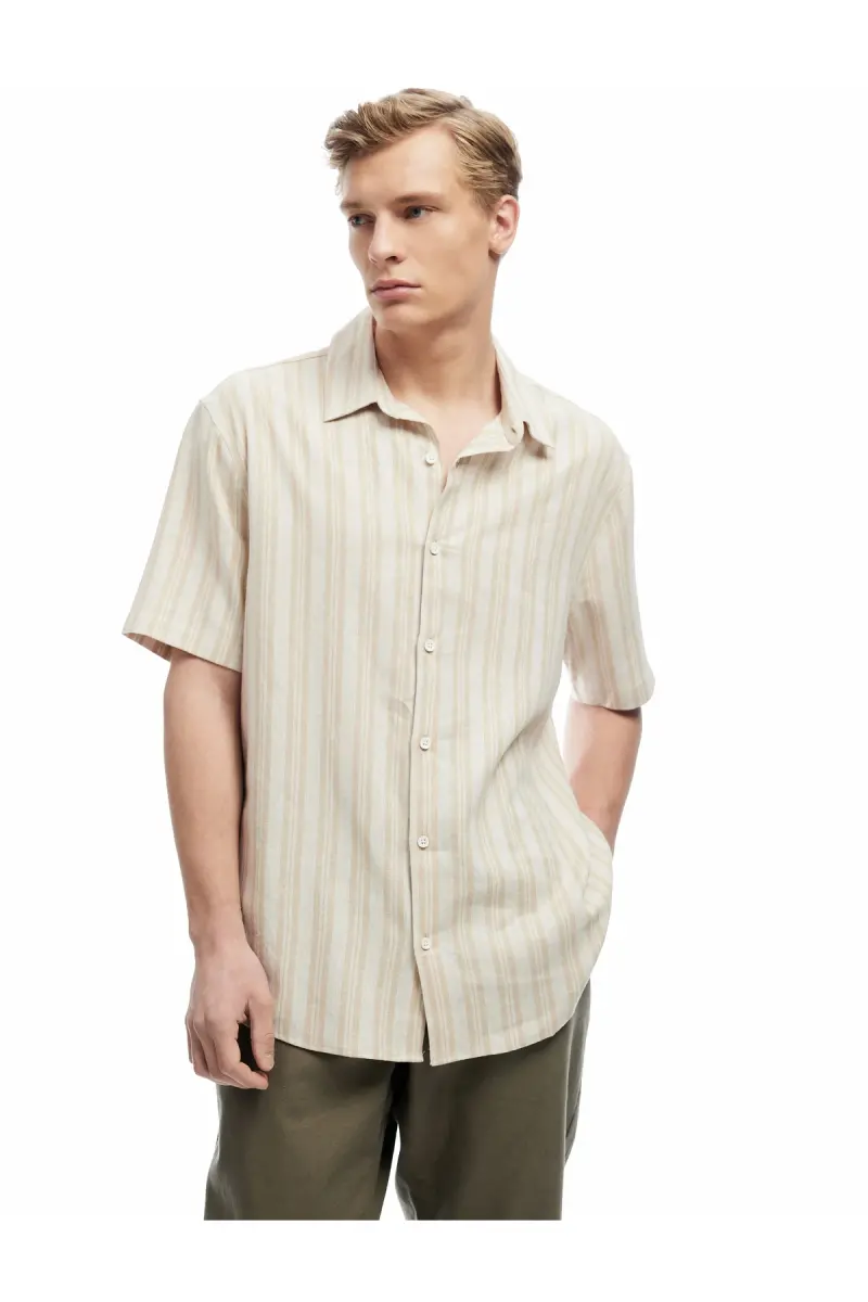 Kısa Kollu Regular Fit Çizgili Keten Karışımlı Gömlek-Ekru Çizgili
