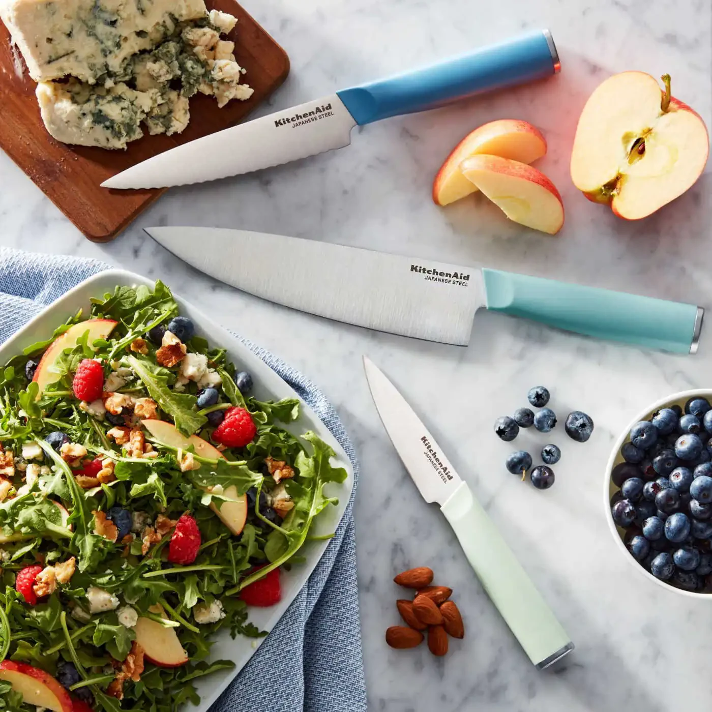 KitchenAid Classic 3 qismli zanglamaydigan po'latdan yasalgan oshpaz pichog'i to'plami oshxonadagi hamma narsani kesish uchun mukammal tanlovdir. To'plamdagi uchta pichoq har qanday oziq-ovqat uchun mos pichoqni taklif etadi.