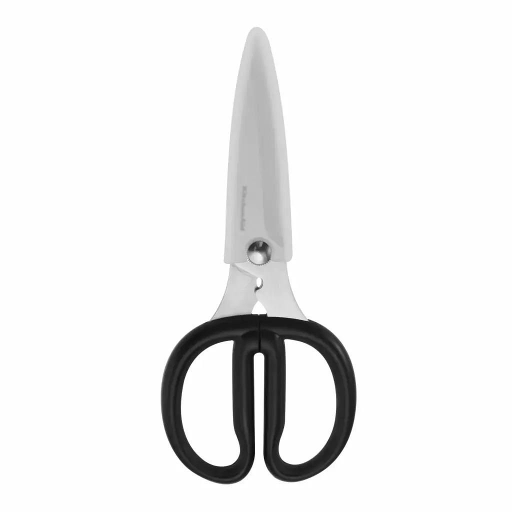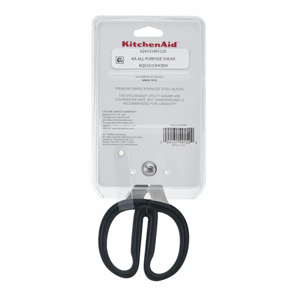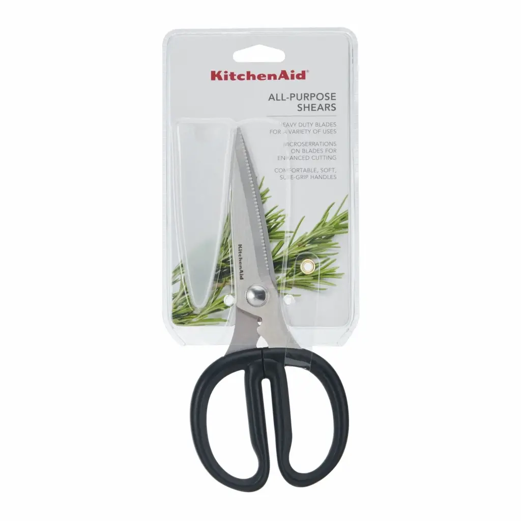 These KitchenAid Shears with a black Soft-Grip Handles are great for a variety of uses in the kitchen and throughout the home. The durable, stainless steel blades withstand rigorous use, and the micro serrations on the blades provide an enhanced cutting experience. These adult soft grip handles maximize comfort and control while using. Dishwasher safe, but hand washing is recommended.KitchenAid Universal All Purpose Shears Black: KQS351OHOBW