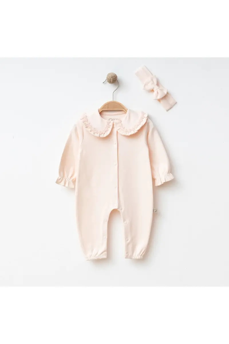 Kız Bebek işlemeli %100 Pamuk Şapkalı Tulum Seti-somon