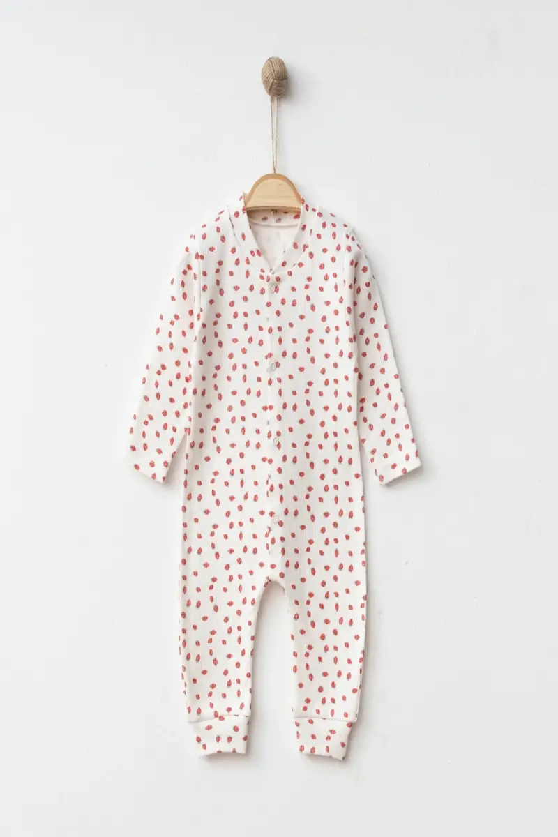 Kız Bebek Küçük Çilek Rapor Baskılı Çıtçıtlı Yenidoğan Bebek Tulumu %100 Pamuk Esnek 1-3-6 Aylık-Beyaz Minik Çilek