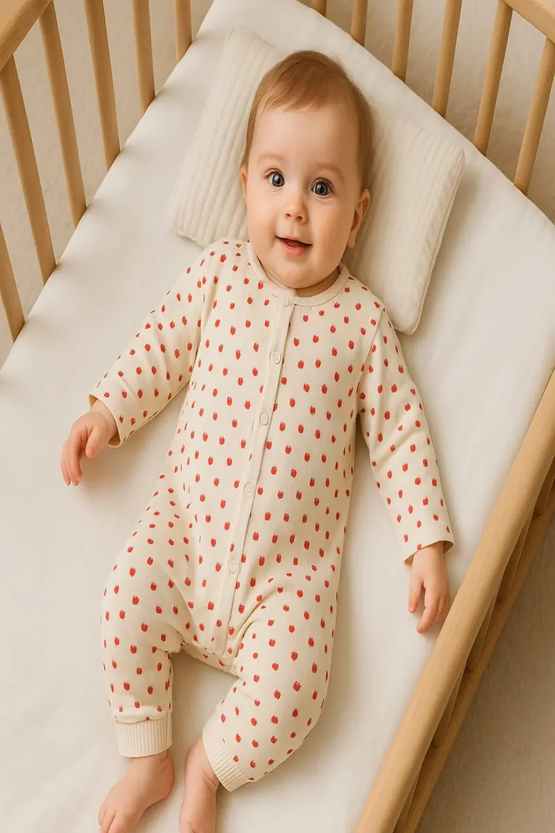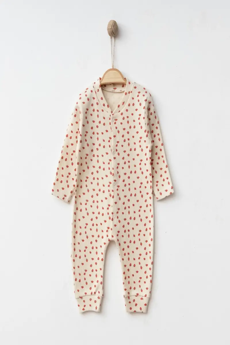 Kız Bebek Küçük Çilek Rapor Baskılı Çıtçıtlı Yenidoğan Bebek Tulumu %100 Pamuk Esnek 1-3-6 Aylık-Ekru Minik Çilek