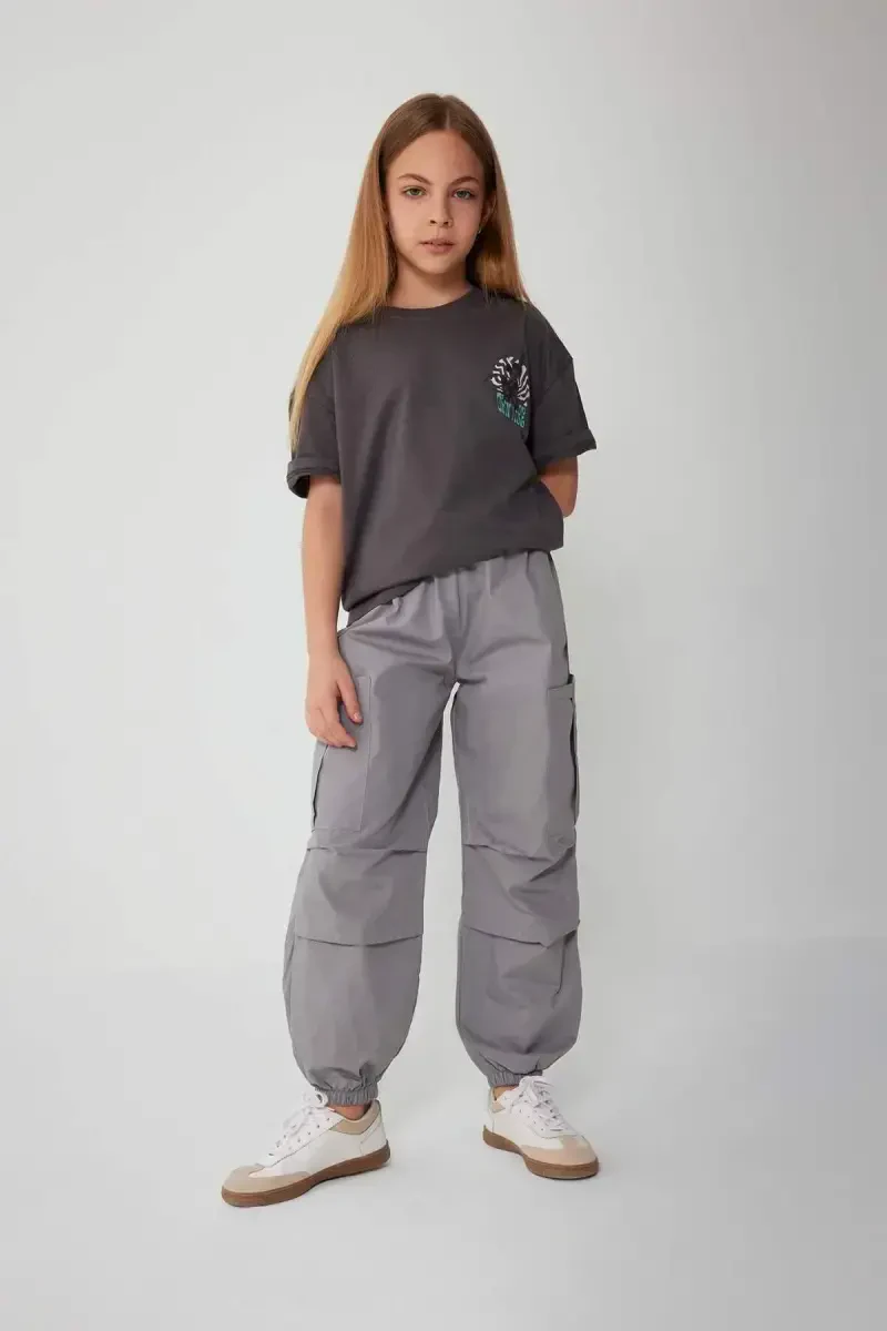 Gray cotton parachute cargo pants for girls. Comfortable fit and practical pockets make it ideal for everyday use.