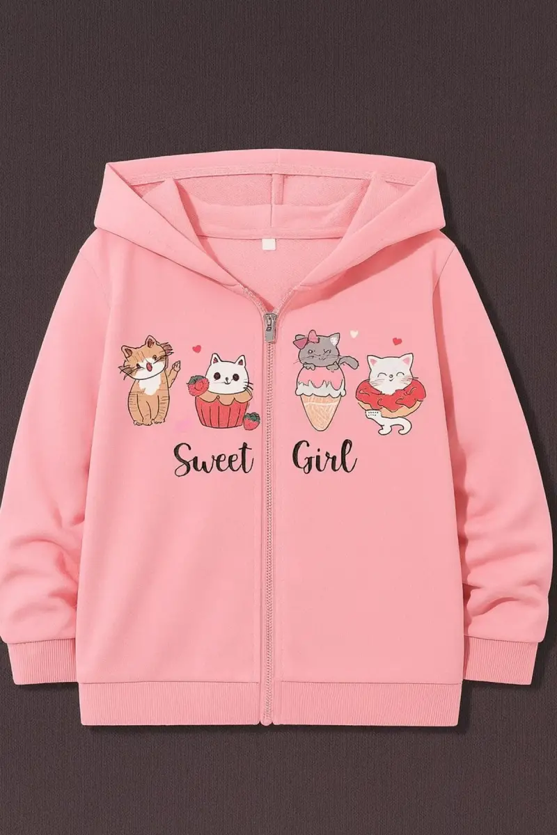 Kız Çocuk Pembe Sweet Girl Baskılı Kapşonlu Fermuarlı Hırka-Pembe