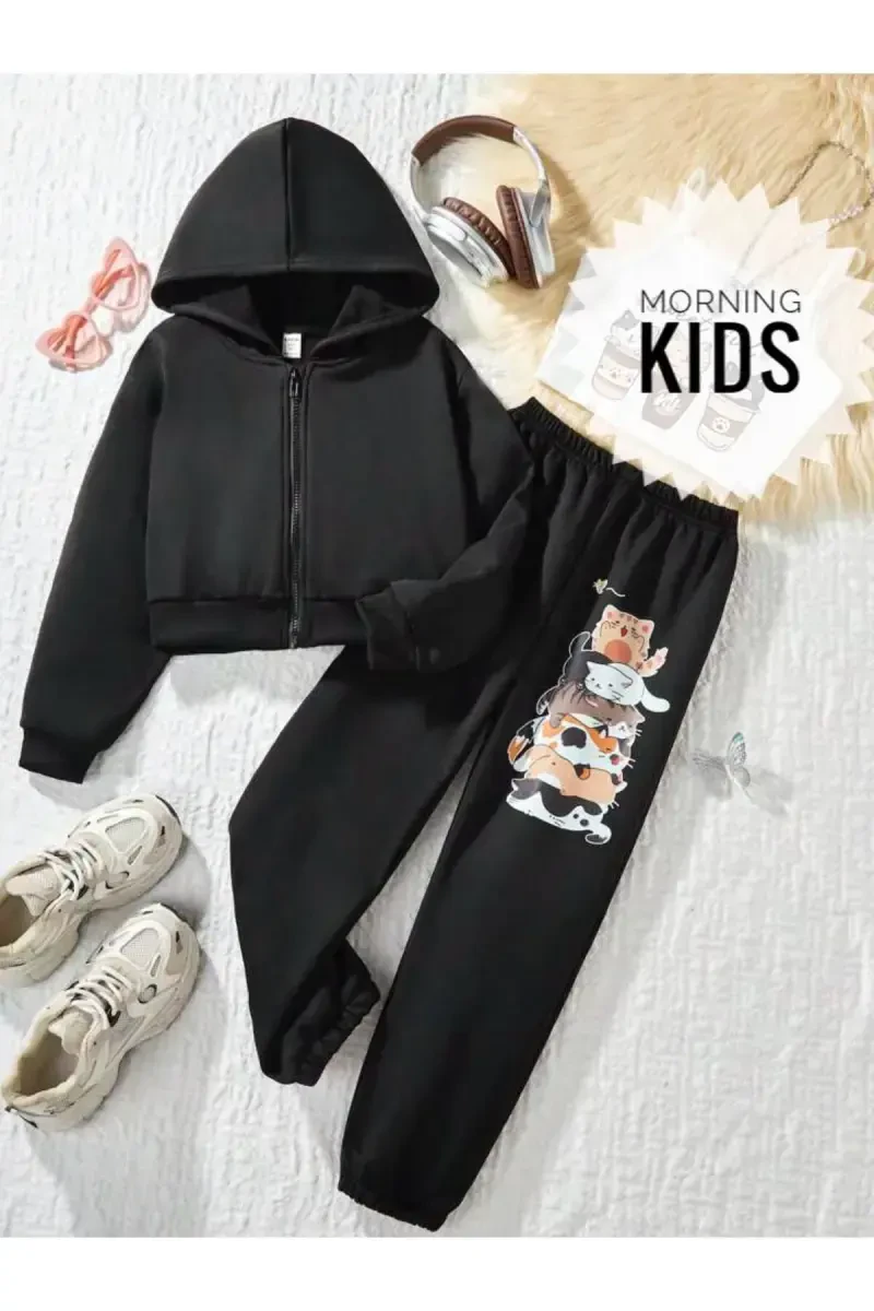 Çocuk eşofman takımı, kız erkek çocuk, kapüşonlu, fermuarlı, şardonlu, yaramaz kediler, baskılı, MORNİNG KİDS, siyah eşofman, slim fit