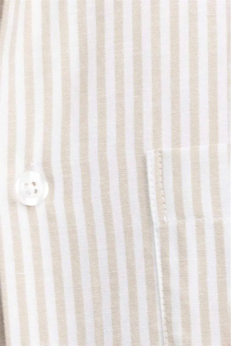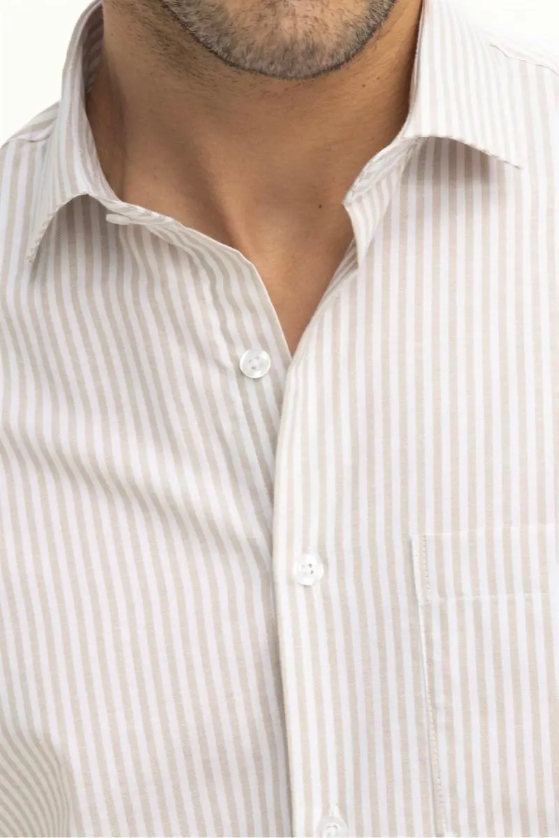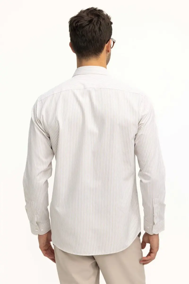 Klasik Fit Uzun Kollu Ince Çizgili Pamuklu Kravatlık Yaka Erkek Bej Gömlek-Bej