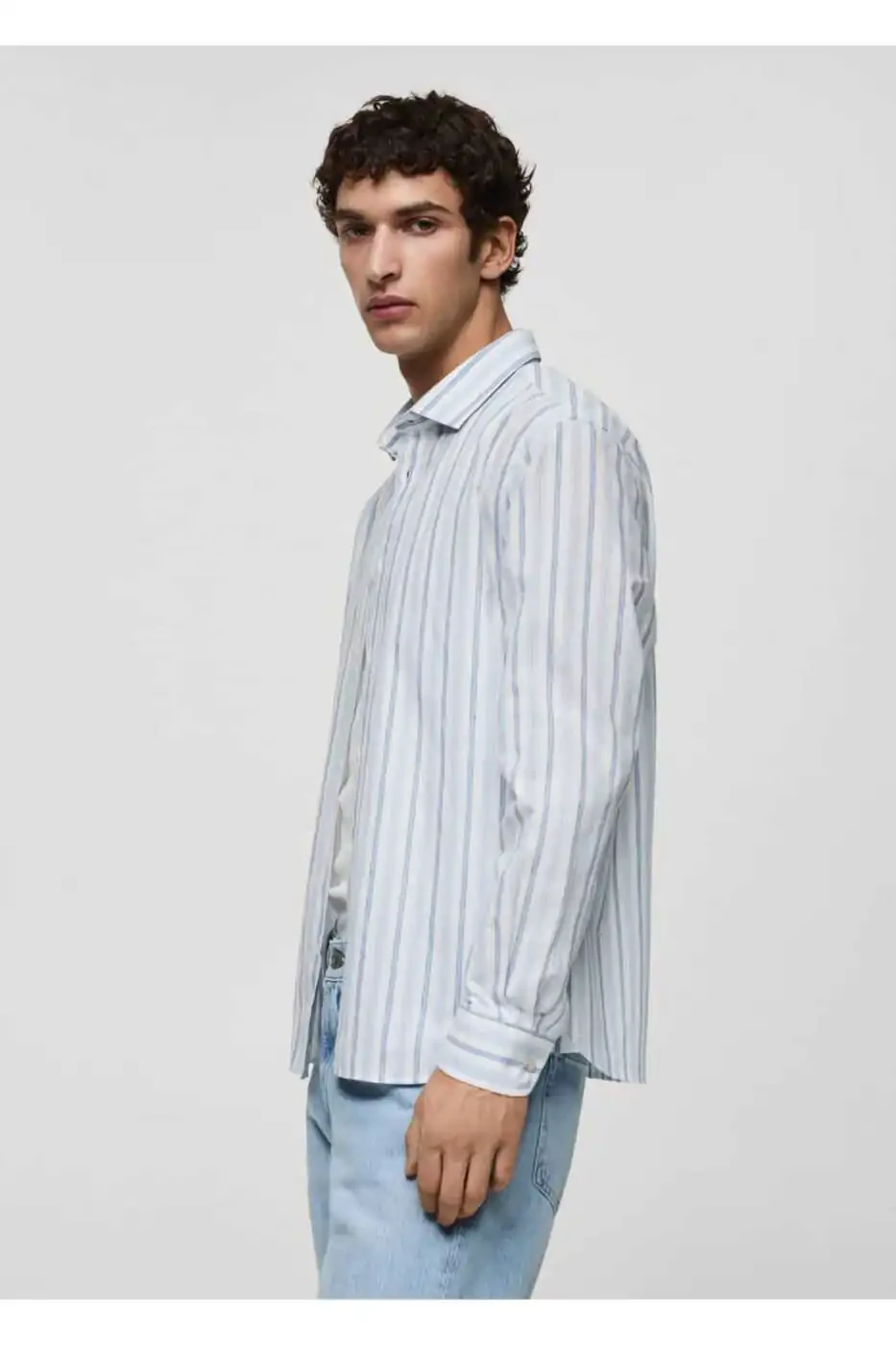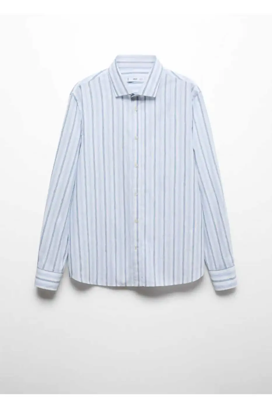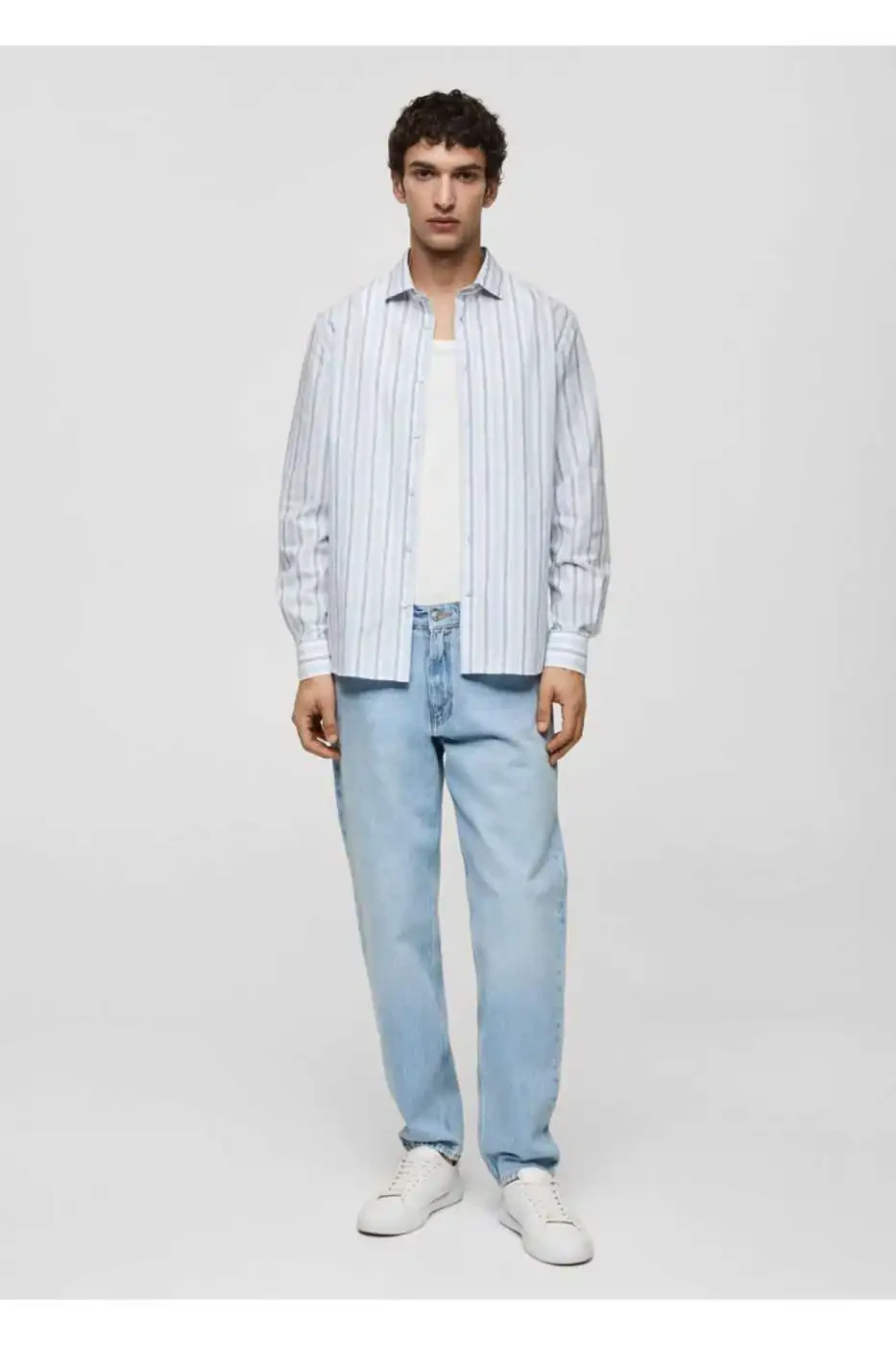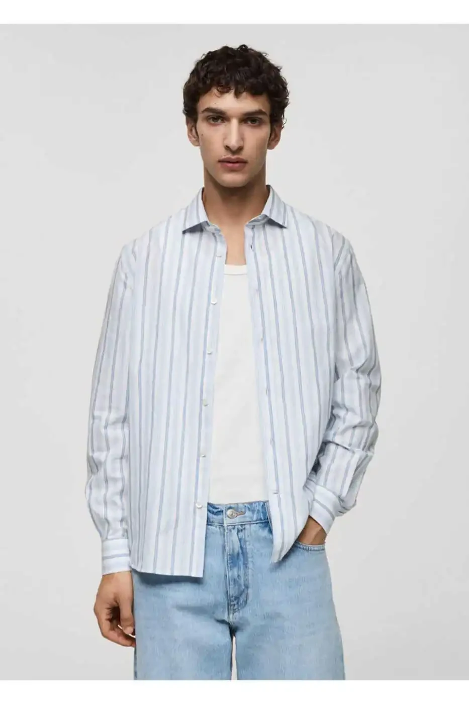 Klassik kesimdagi paxta-zig‘ir aralashmasidan tayyorlangan bu qishloq uslubidagi yo‘l-yo‘lli ko‘ylak vertikal yo‘l-yo‘lli naqshi, ko‘ylak yoqasi, old tomondan tugmali yopilishi, uzun yengi va tugmali manjetlari, yeng tepasi yumaloq shakliga ega dizayni bilan ajralib turadi. Paxta tarkibida 79%, zig‘ir tarkibida 21% bo‘lgan ko‘ylakning yon tikuvining uzunligi 39,2 sm, orqa uzunligi esa 78,0 smni tashkil etadi, bu esa bo‘yi 185 sm va M o‘lcham kiygan modelimizda ko‘rsatilgan. Mashinada maksimal 30°C haroratda yuvish mumkin bo‘lgan ko‘ylakni oqartirgichdan foydalanmaslik kerak, maksimal 110°C haroratda dazmollash mumkin, perkloretilen quruq tozalash qo‘llanilishi mumkin va kir yuvish mashinasida quritilmaydi.