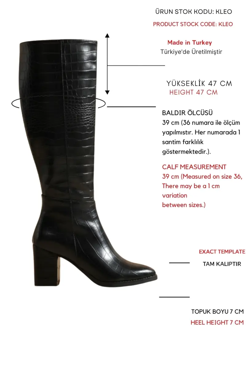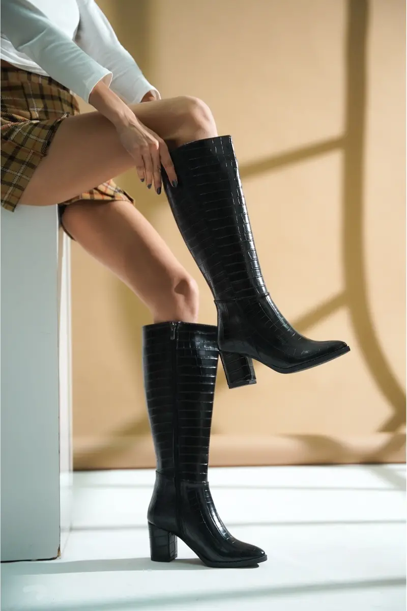Kleo Siyah Krokodil Deri Topuklu (7cm) Yanı Fermuarlı Günlük Kullanım Çizme-Siyah Kroko