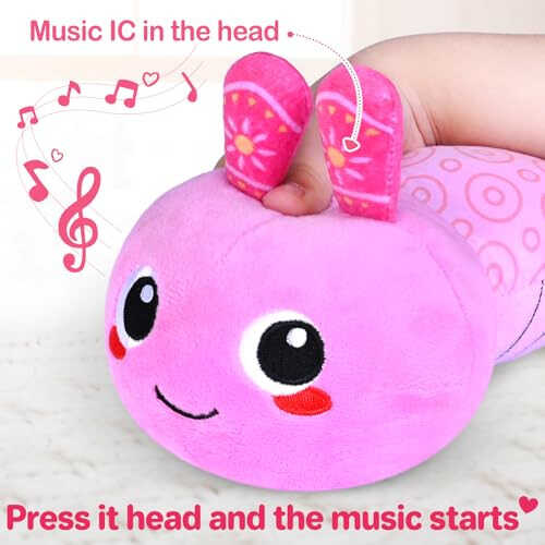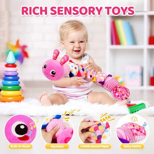 Infant Plush Toy with Sounds: We hide crinkle paper sound, sweet bells and squeaking sounds inside the animal's body, baby discover these interesting sounds through pinching, pressing, and shaking. Also press its eyes to play a lullaby, you can use it to soothe the baby. These soft stuffed animals are designed to entertain 0-3 3-6 6-12 months newborn baby, ensuring your baby hours of fun and promote brain development. Safe & Durable: The plush playset is made from premium plush and natural cotton without small parts, with a baby safe design, using ultra-strong stitching technology, ensuring safety and durability. The 100% non-toxic materials can provide baby aged 0 months and up a safe play experience and save parent’s worry. Baby Montessori Toys: Features built-in rattle, crinkle paper, and squeaker, our plush animal playset aids in visual and auditory stimulation for baby's development. They are in the different textures on the material and different sounds, very easy to attract baby's attention. Child will have multiple sensory experience. It helps baby to develop fine motor skills and get auditory development. Early Developmental Toys: Funny colors develop the visual ability and diverse textures build up the tactile sense. They could interest the baby and enrich the tummy time. The plush toy is designed for little hands, encourage babies to grasp & explore with ease. And we design a 20-inch ruler on the surface of this infant caterpillar plush's tummy. Parents can apply it to measure baby‘s height and record his/her growing. Ideal Gift for 0-12 Months: It is a perfect gift for newborns as the sensory learning toy and the baby soothing toy. This musical baby toy could be applied as montessori toy to stimulate the intelligence and encourage more exploration. Also, it would improve the parents-child interaction. Suitable for Baby Girl and Boy 0-3-6-9-12months.