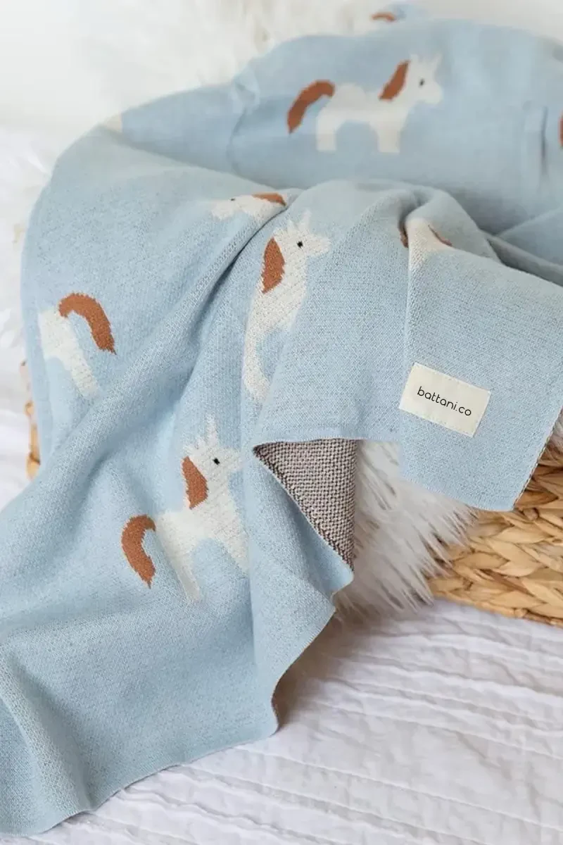 Knitted Baby Blanket - Unicorn Themed Blue (85x85cm) Baby Girl/Boy