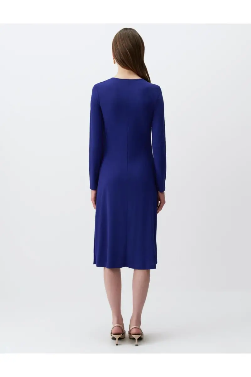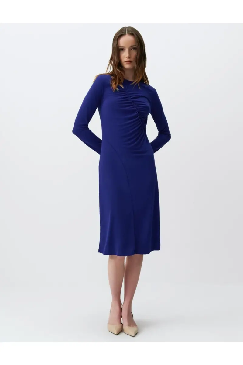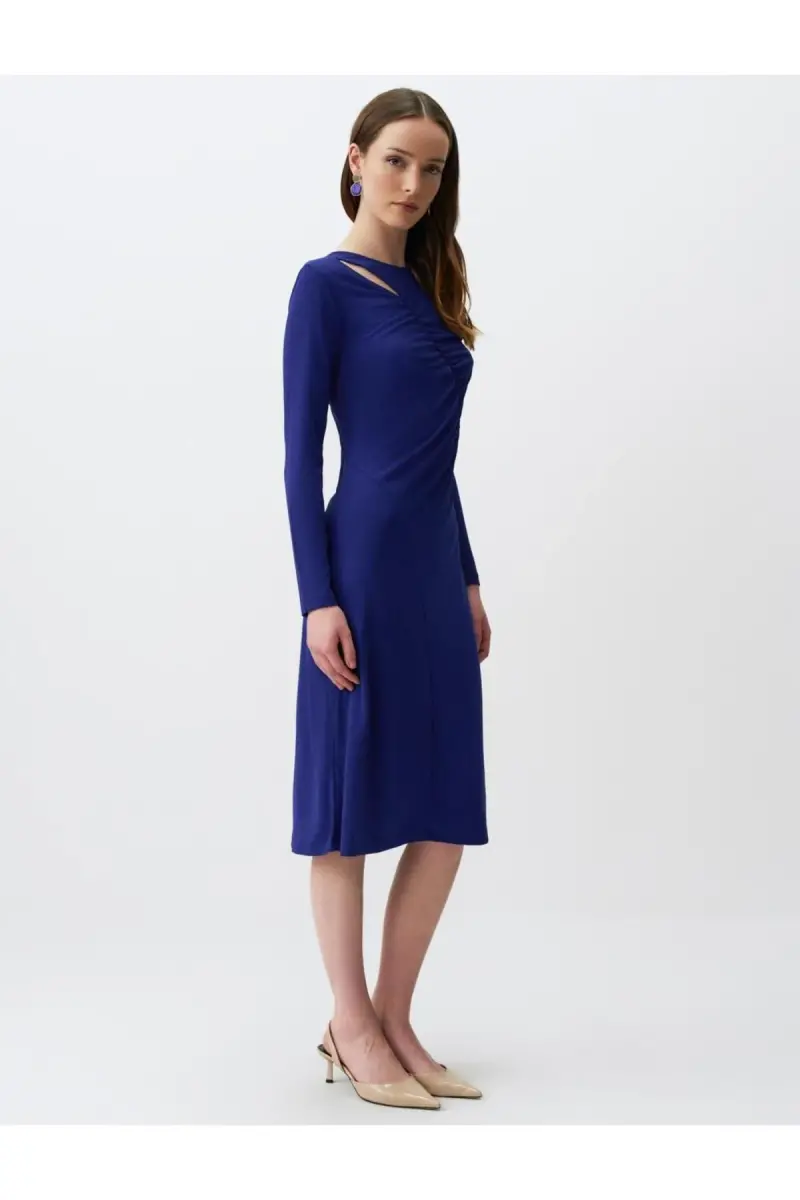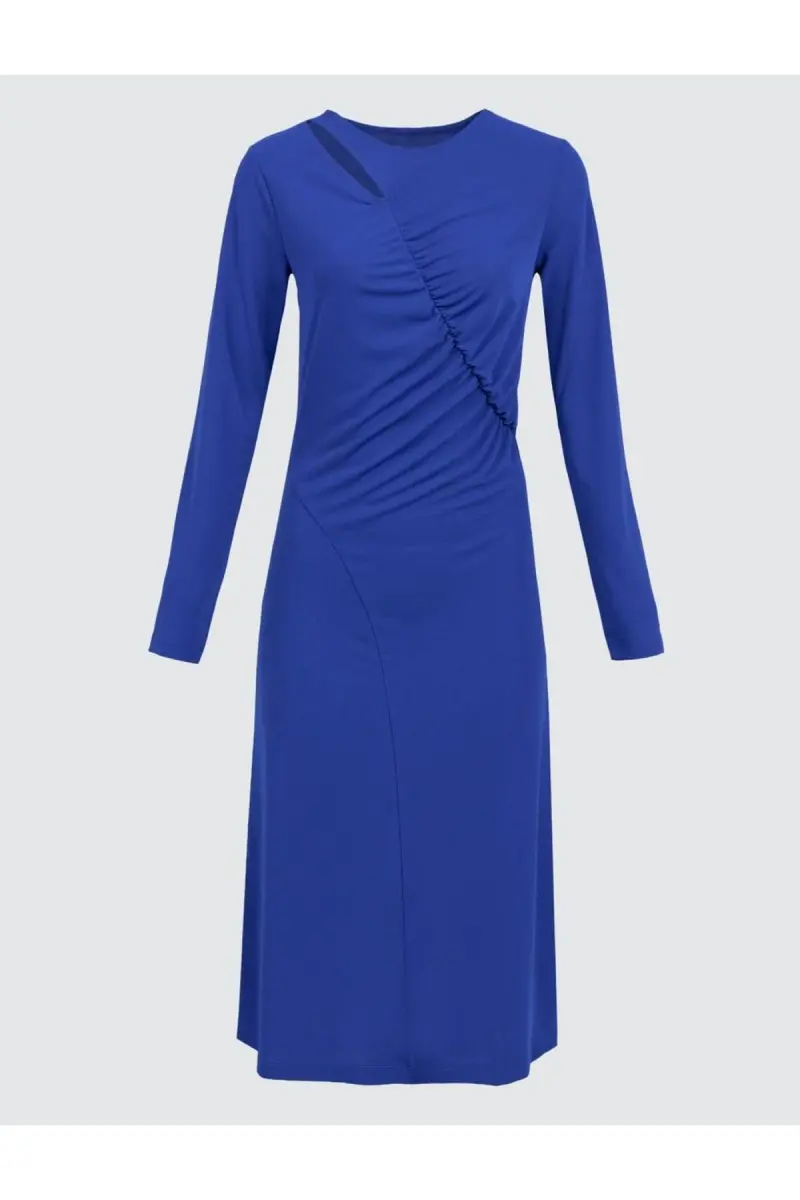 Kobalt mavi rengiyle göz alıcı bir stil sunan bu midi elbise, şıklığı ve rahatlığı bir araya getiriyor. Zarif pencere detayları, elbisenin minimal çizgilerine sofistike bir dokunuş katarken, uzun kolları sizi her mevsimde rahat etmenizi sağlıyor. Günlük kullanım için ideal olan elbise, özel günlerinizde de şıklığınızı tamamlayacak.