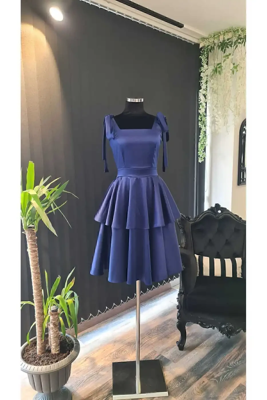 Lacivert Saten Fiyonklu Elbise | Kare Yaka Şık Mini Elbise