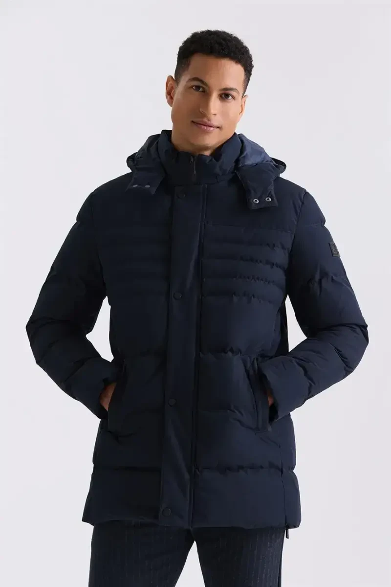 100% poliesterdan tayyorlangan to'q ko'k rangli oddiy kiyim hakim yoqali yashirin fermuarli ko'p-ko'p kurtka sovuq havolarda issiqligingizni saqlab qolish uchun ideal tanlovdir. Hakim yoqa va yashirin fermuar dizayni bilan kurtka nafis ko'rinishga ega bo'lib, harakat erkinligini ta'minlovchi oddiy kiyim kesimi qulay foydalanishni ta'minlaydi. 187 sm bo'yli, 78 kg vaznli va yelkasi 120 sm bo'lgan model ustida 50 o'lchamli kiyim kiyilgan.