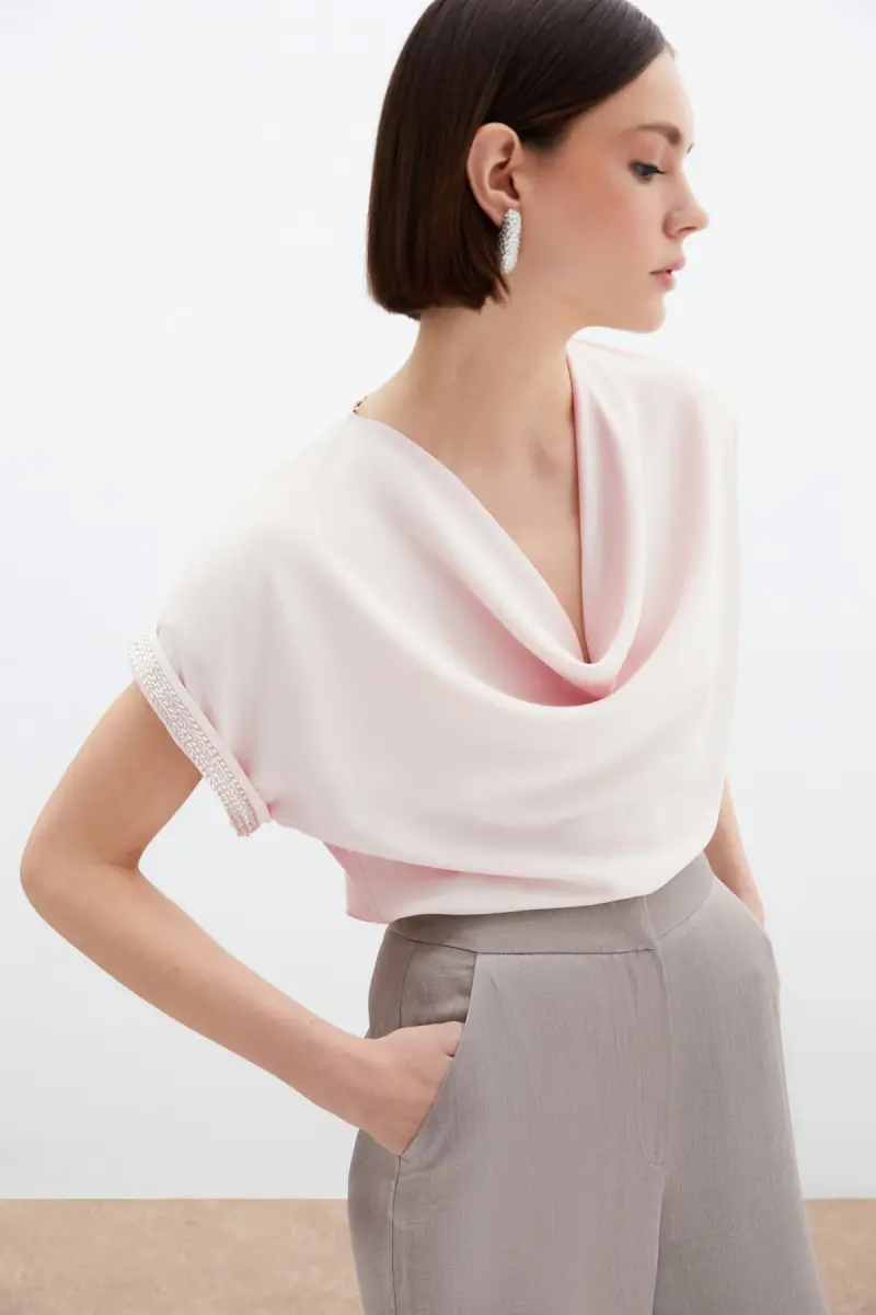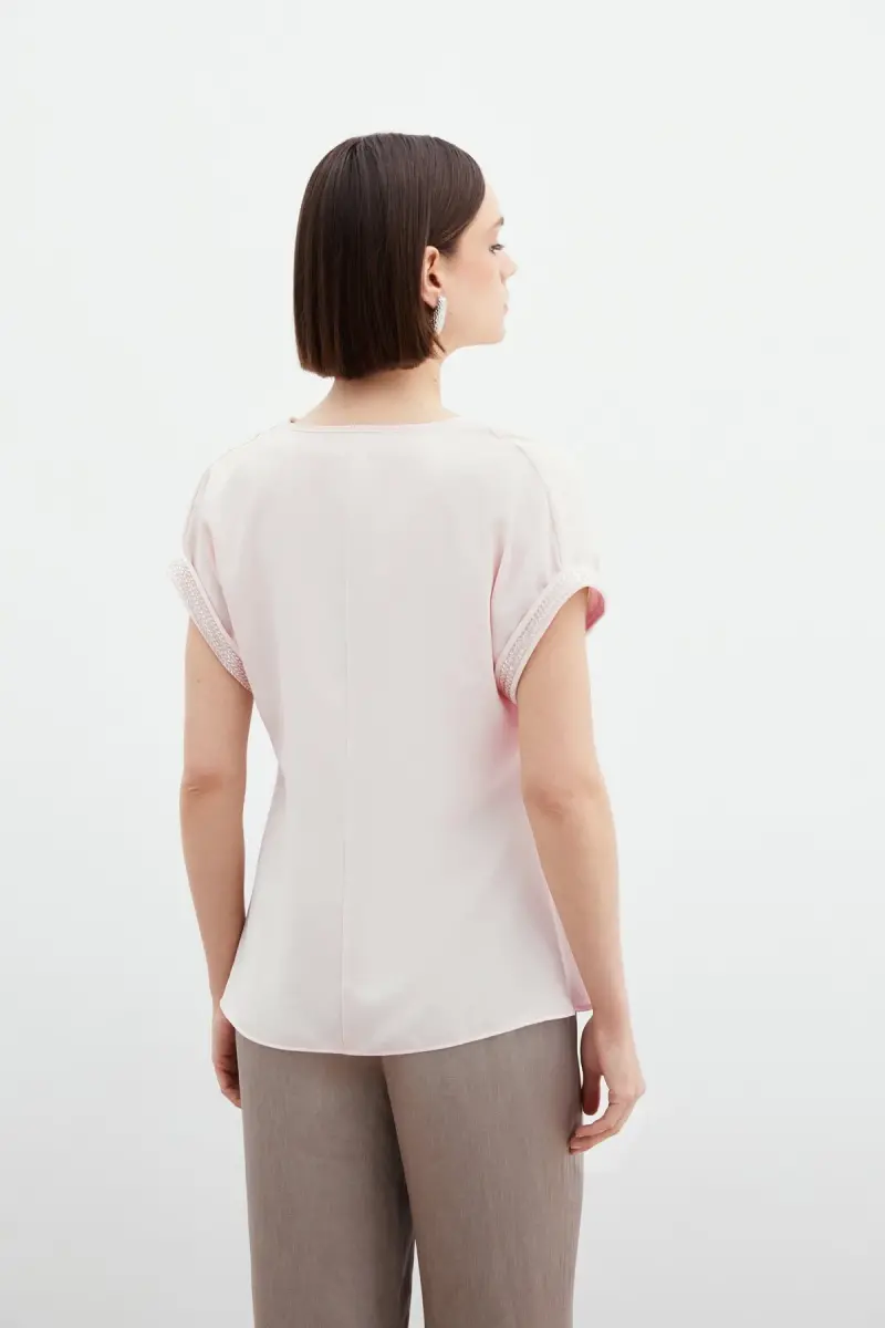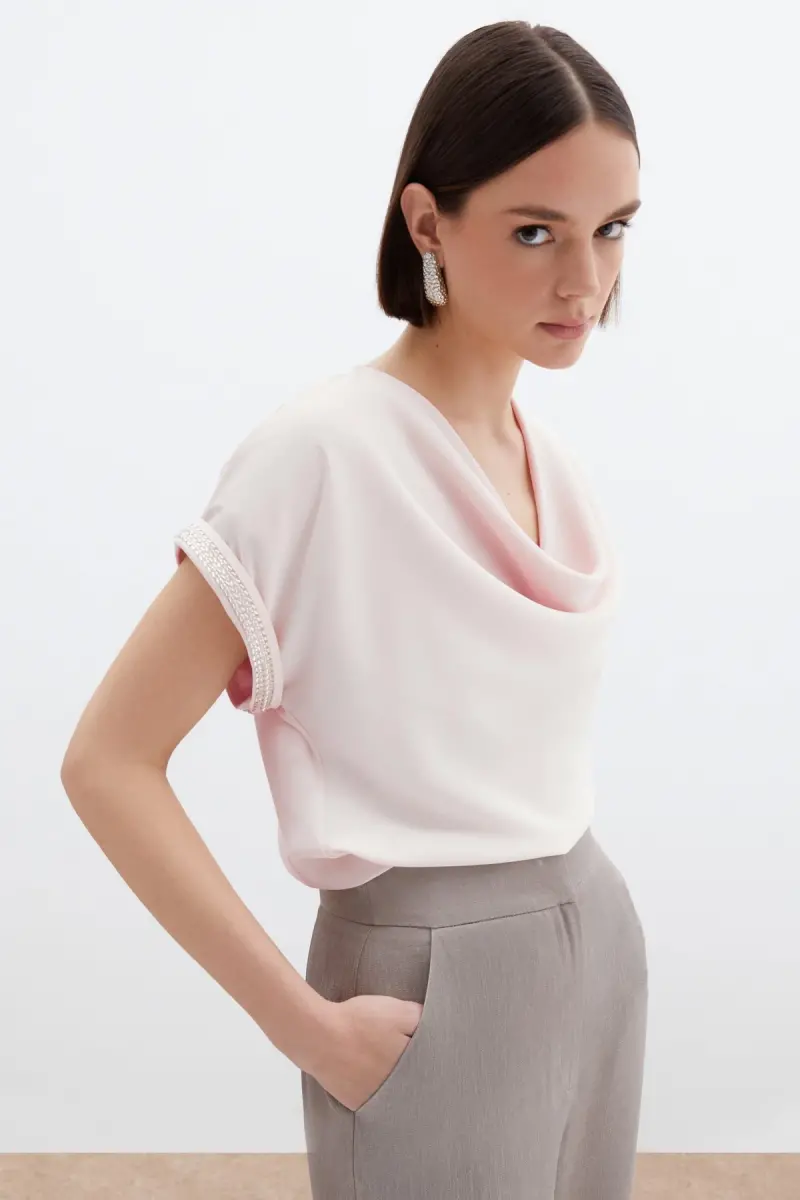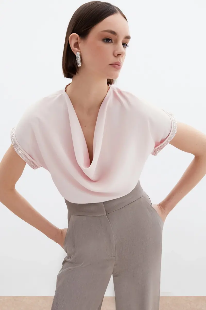 Kollar Taş Detaylı Salaş Bluz - Pudra-Pudra