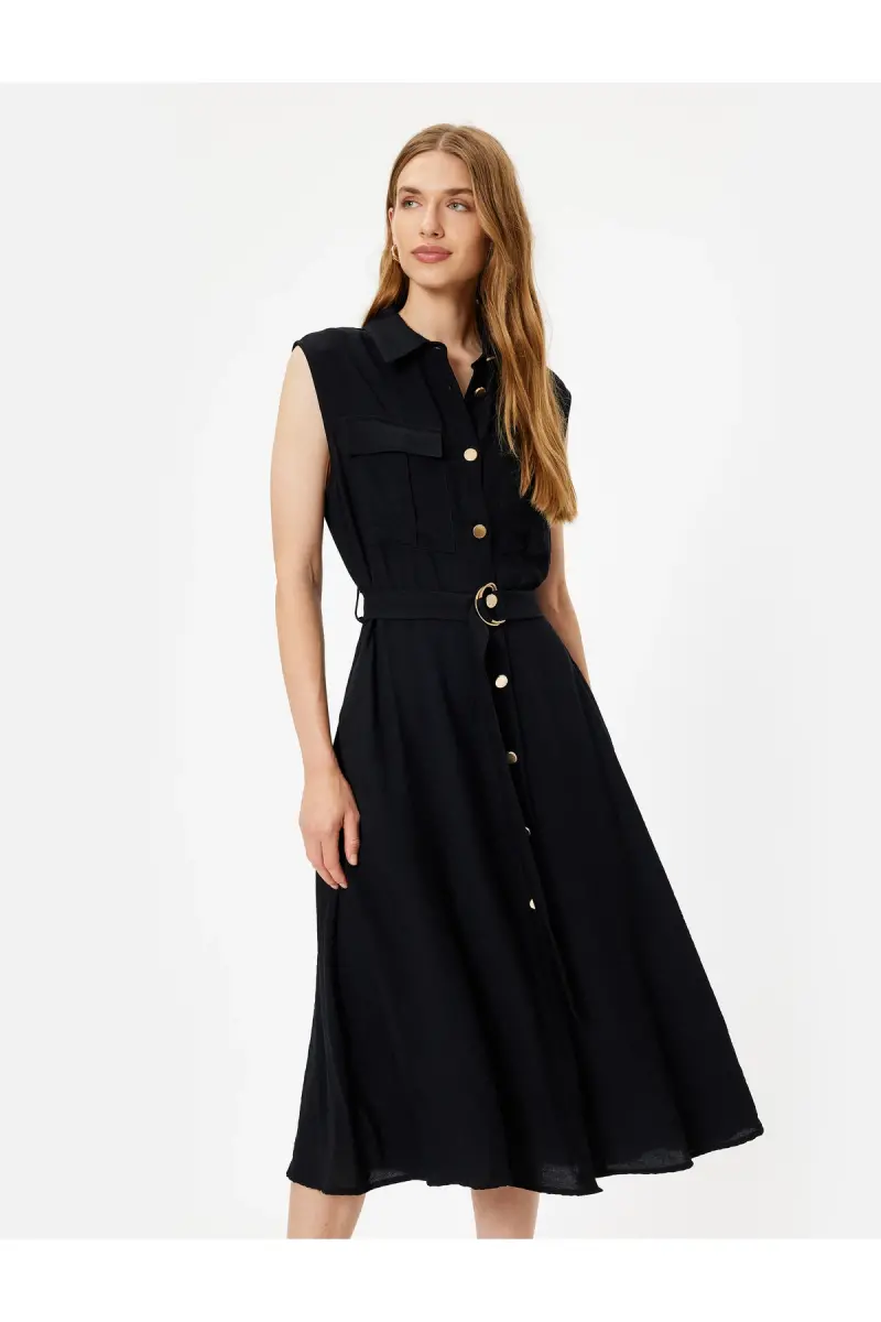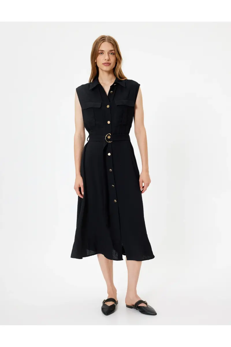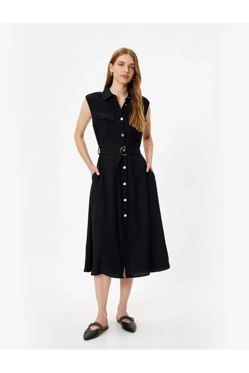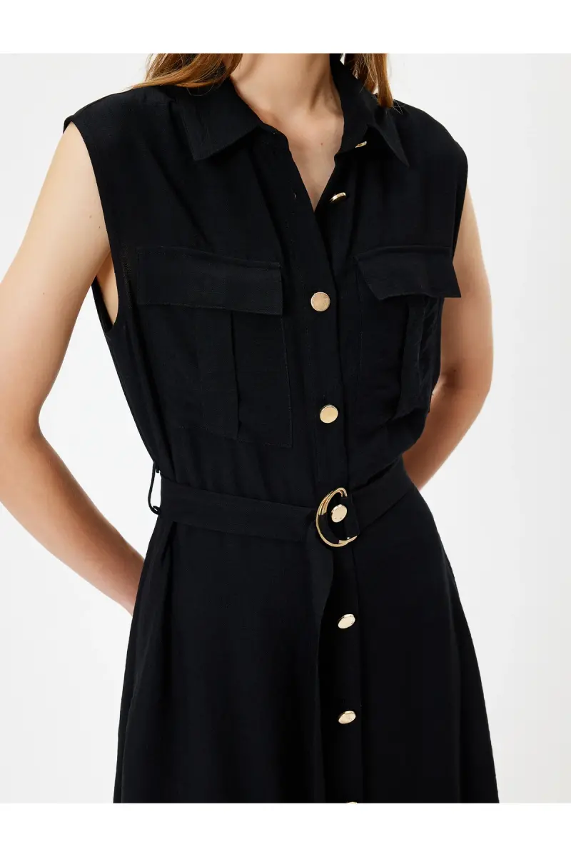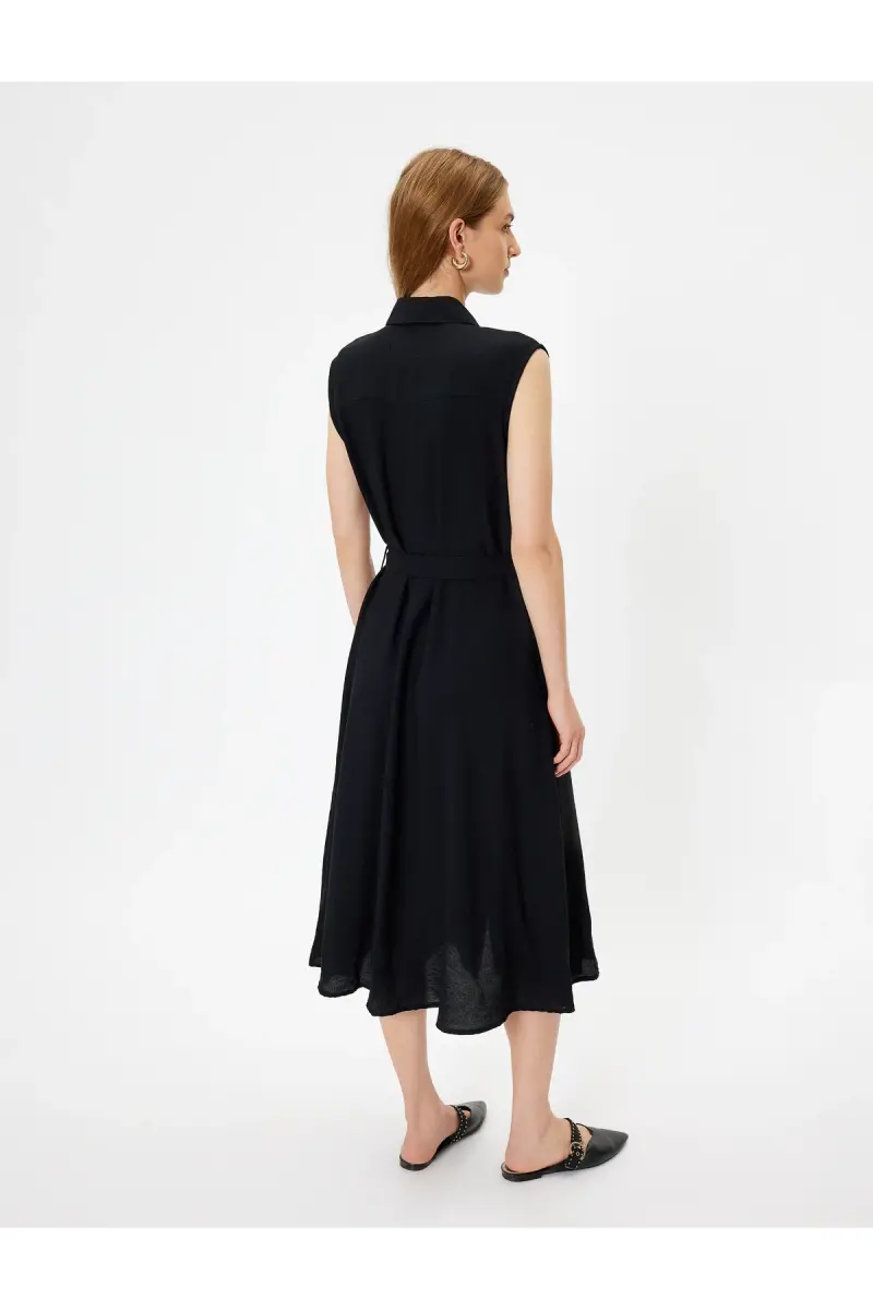 Kolsuz Midi Boy Gömlek Viskon Elbise Kemerli Cep Detaylı-Siyah