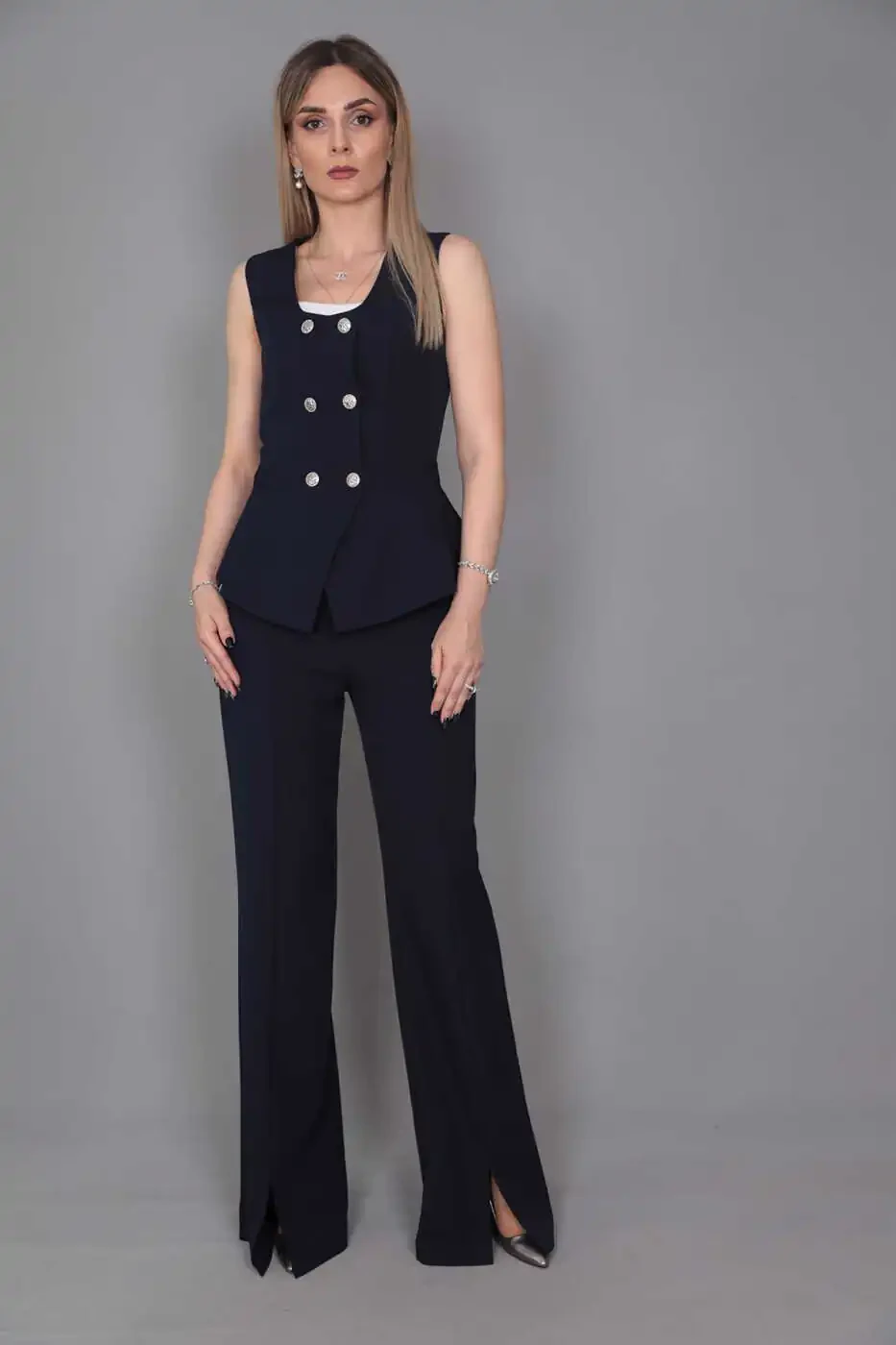 жилет aller, брюки с испанскими разрезами, комплект, темно-синий, женская одежда, стильная одежда, удобная одежда