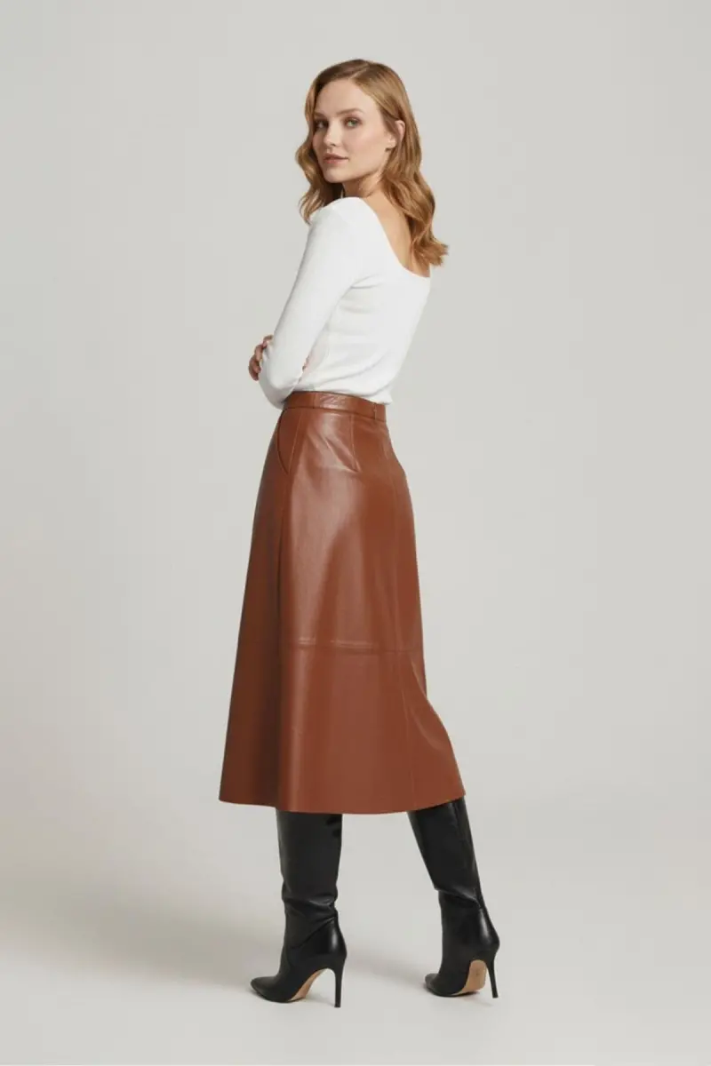 Konyak Kadın Önden Çıtçıt Kapamalı Kloş Uzun Hakiki Deri Etek-KONYAK