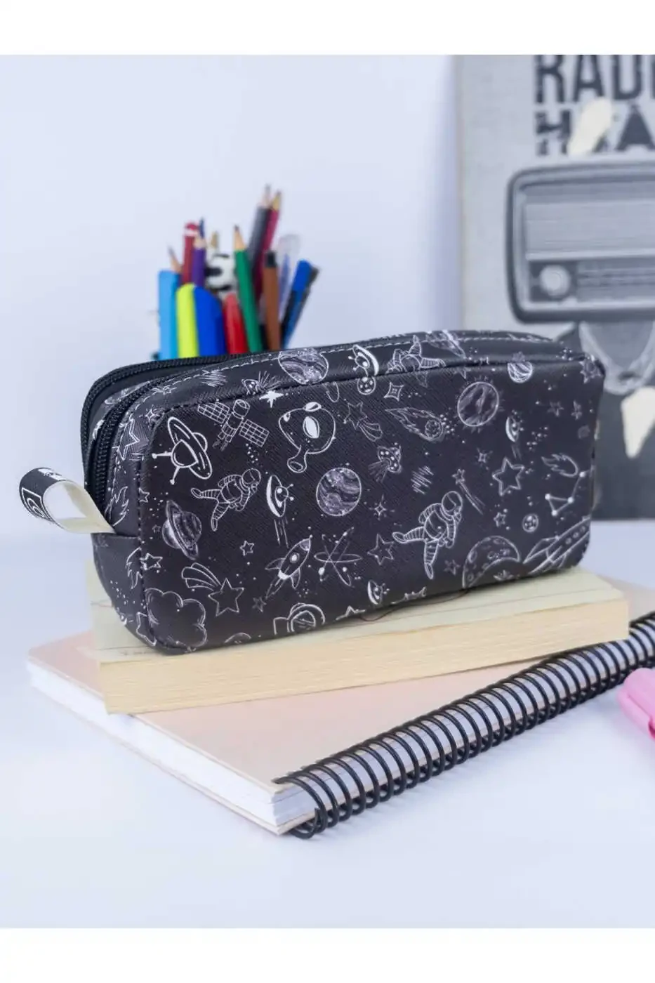 Ish stolingiz yoki sumkangizning eng chiroyli va amaliy to'ldiruvchisi! Kosmos mavzusidagi dizayni bilan diqqatni tortadigan, ikki bo'limli tuzilishi bilan juda amaliy qalamchasi. Vegan teridan tayyorlangan, u ekologik toza va bardoshli, yuqori sifatli ishlab chiqarilishi bilan uzoq yillar davomida foydalanishingiz mumkin bo'lgan mahsulot.