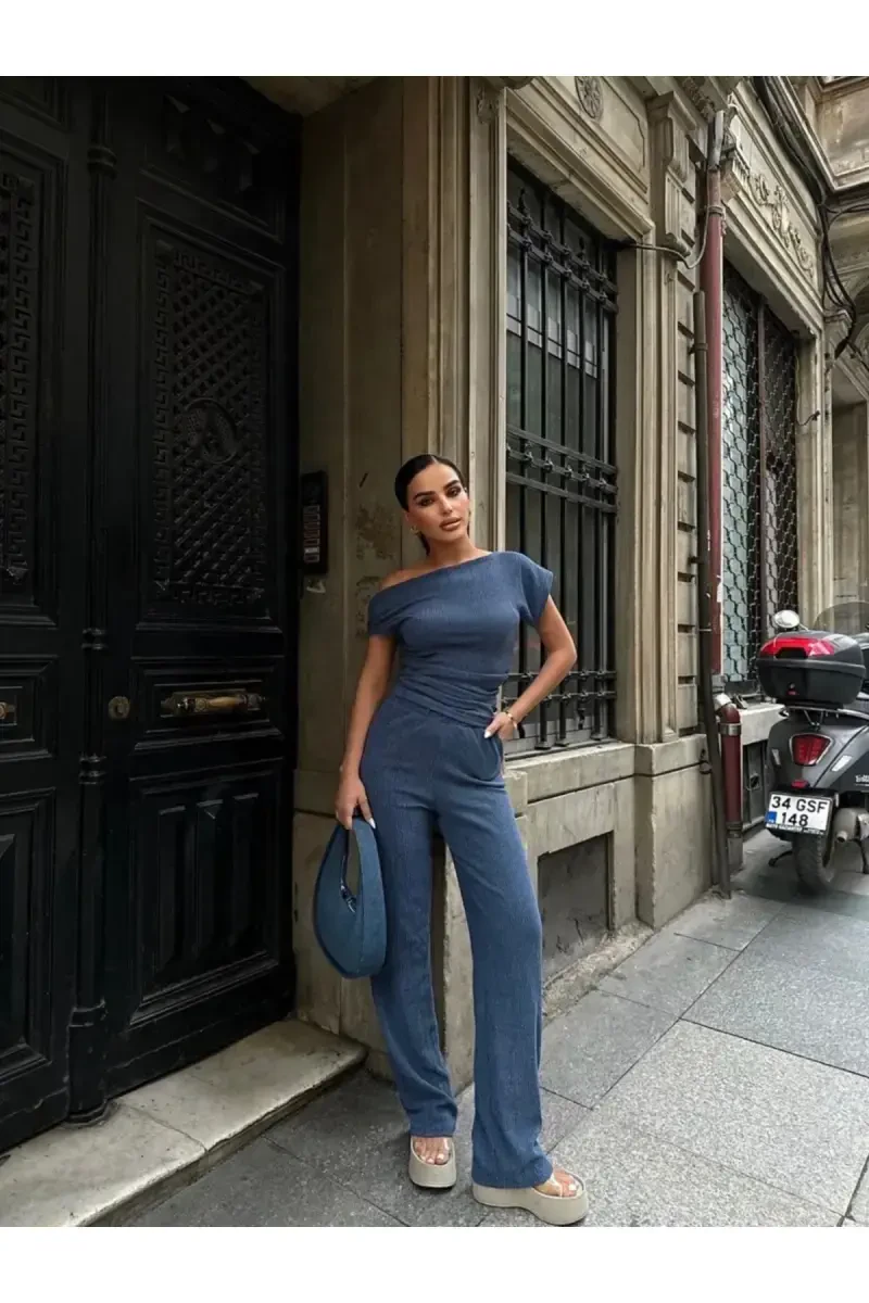 Каяк Яка Бюзгюлю Блуз Панталон Такым | Мави Шыклык ве Рахатлык