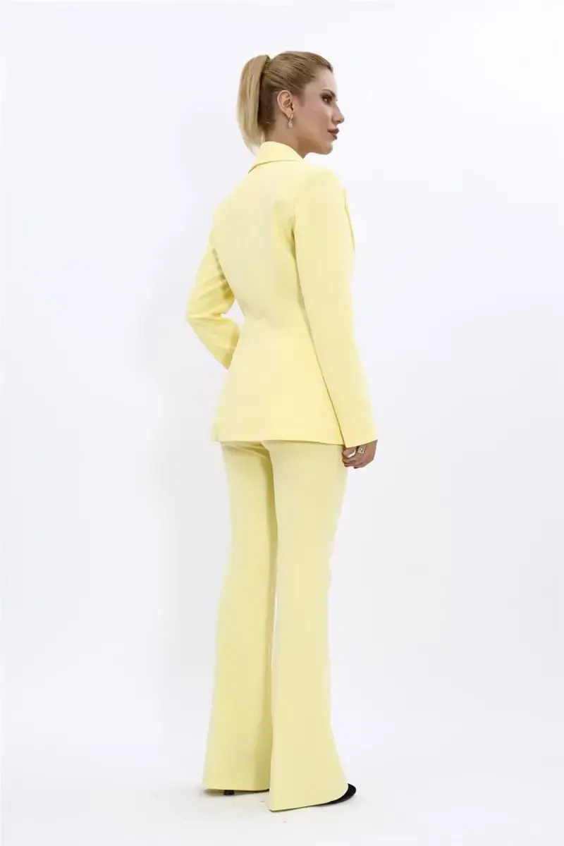 Познакомьтесь с нашим комплектом классического пиджака с воротником и брюк-клеш, сочетающим в себе элегантность и комфорт! Этот эксклюзивный комплект желтого цвета, отражающий вашу энергию, будет сопровождать вас как в повседневной жизни, так и в особых случаях. Этот комплект производства ÖNDER ÖZSOY, изготовленный из высококачественных материалов и имеющий современный крой, станет незаменимым в вашем гардеробе. Наш комплект состоит из классического пиджака и модных брюк-клеш. Пиджак привлекает внимание элегантным воротником и одной пуговицей спереди, а брюки имеют эластичный пояс и боковую молнию для комфортного использования. Этот комплект понравится стильным женщинам и придаст им неповторимый вид. Этот комплект собственного производства был тщательно подготовлен и изготовлен в соответствии со стандартами качества. Цвета могут отличаться из-за разницы в освещении при студийной съемке, поэтому между фактическим цветом продукта и цветом на вашем экране могут быть небольшие различия. Вы можете наилучшим образом отразить свой стиль, приобретя этот стильный и удобный комплект. Помните, что этот эксклюзивный комплект предлагается по акционной цене в ограниченном количестве.