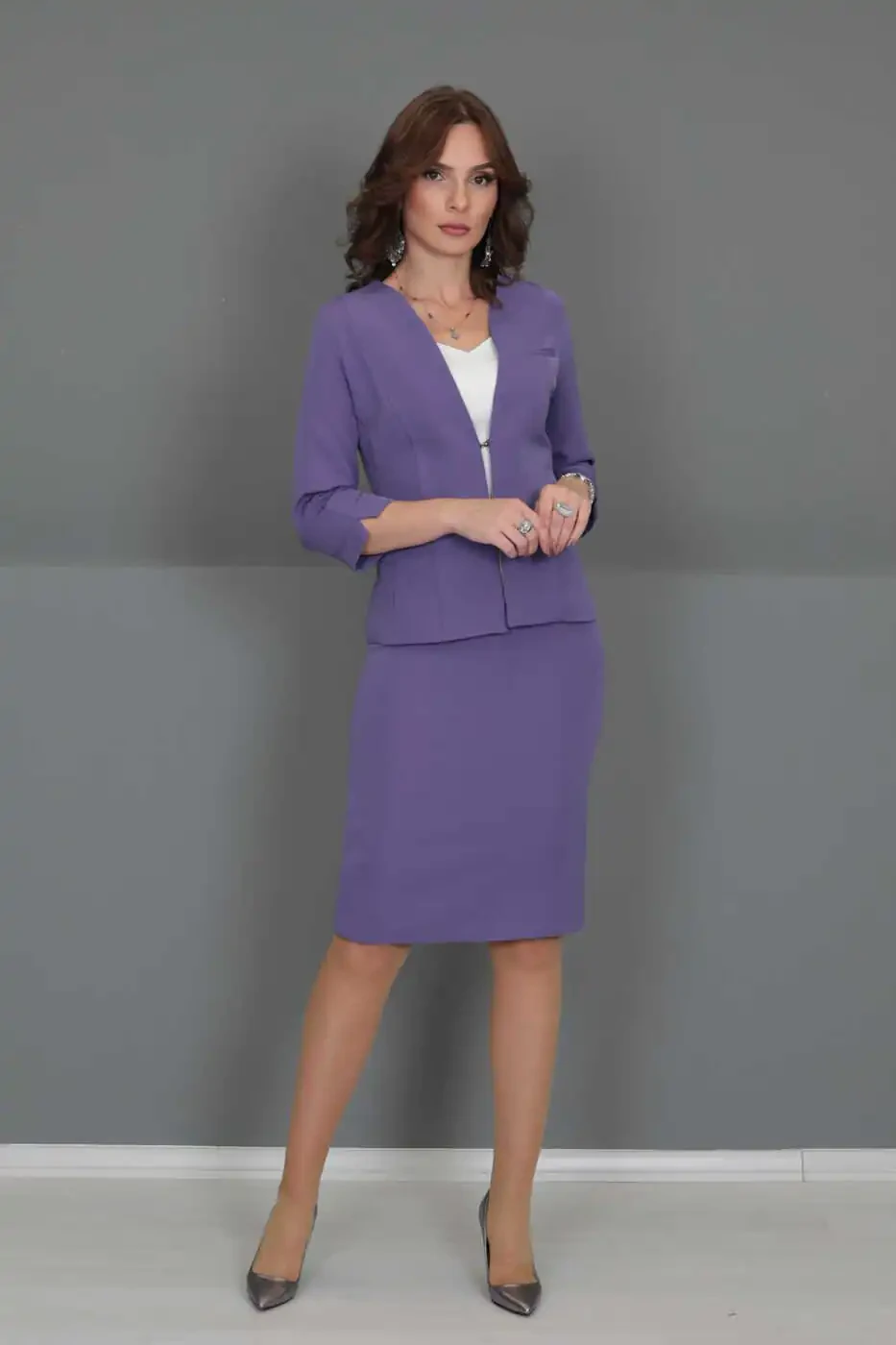 Наш костюм с коротким жакетом с V-образным вырезом и юбкой-карандаш, разработанный для сочетания стиля и комфорта, придаст вам потрясающий вид в любой обстановке. Наш костюм, который добавляет элегантный штрих своим лиловым цветом, идеально подойдет для многих мероприятий, от деловых встреч до особых приглашений.