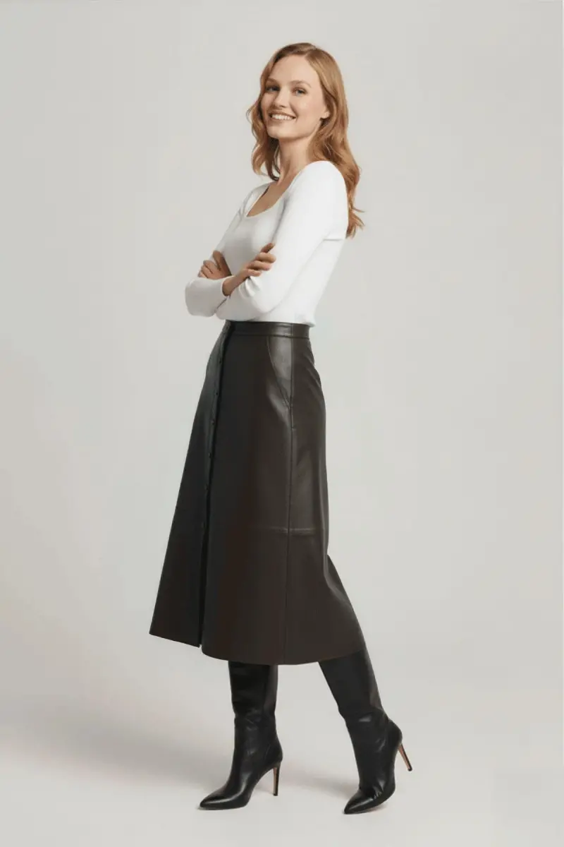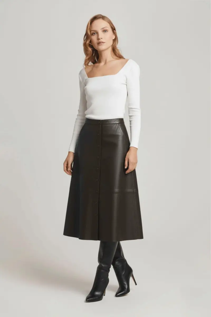 Koyu Kahverengi Kadın Önden Çıtçıt Kapamalı Kloş Uzun Hakiki Deri Etek-KAHVE