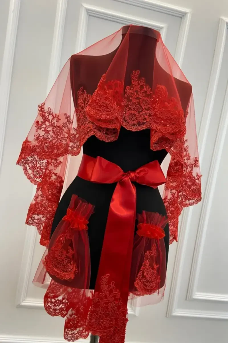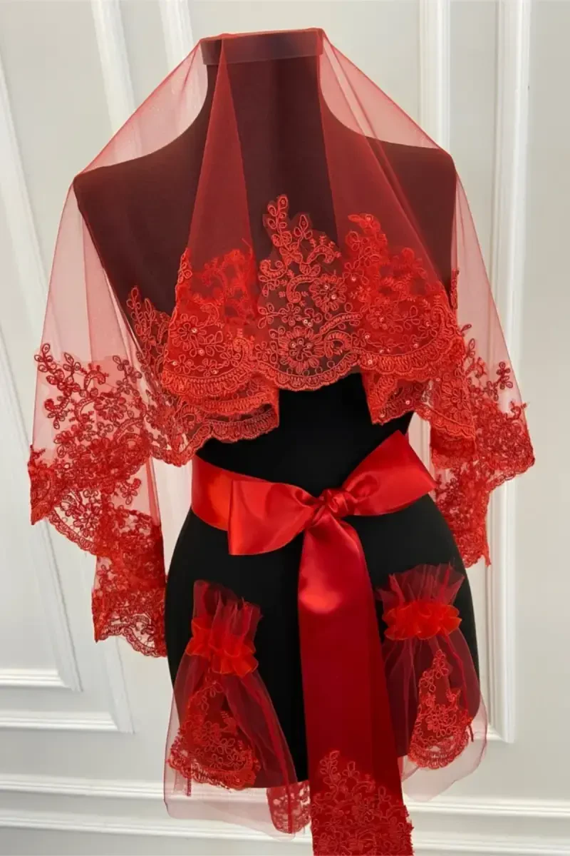Комплект фаты для невесты с красным нежным узором, блестящим гипюром был тщательно разработан, чтобы вы могли создать неповторимый образ в свой самый особенный день. Фата привлекает внимание изящными гипюровыми деталями, вышитыми на высококачественном тюле. Яркость красного цвета в сочетании с нежными узорами гипюра создает привлекательный контраст. Сверкающие блестки дополняют ваше свадебное платье, сияя при каждом движении фаты, и придают вам волшебный вид. Другие аксессуары в комплекте также разработаны в соответствии с фатой и подчеркивают элегантность вашего свадебного платья. Этот комплект - не просто фата, а произведение искусства. Он станет особым сувениром, который навсегда останется в ваших свадебных фотографиях и воспоминаниях. Осуществите платье своей мечты с помощью комплекта фаты для невесты с красным нежным узором, блестящим гипюром и сделайте день своей свадьбы незабываемым.