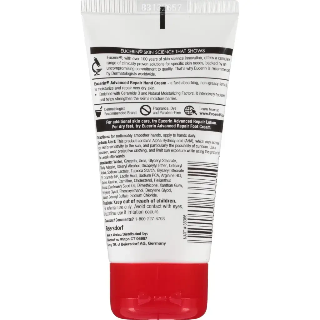 Крем для рук Eucerin Advanced Repair без запаха, 76 г в тубе, специально разработан для рук, чтобы помочь восстановить очень сухую кожу. Этот лечебный крем для рук заметно смягчает и разглаживает кожу рук уже после первого применения. Этот восстанавливающий крем для рук Eucerin содержит альфа-гидроксикислоту для мягкого отшелушивания, а также обогащен керамидами-3 и натуральными увлажняющими факторами. Быстро впитывающаяся, нежирная формула мгновенно делает кожу гладкой и обеспечивает ее необходимым увлажнением. Этот крем для рук Eucerin для сухих рук не содержит отдушек и красителей, и достаточно деликатен для ежедневного использования в качестве крема для сухих рук. Eucerin - это рекомендованный дерматологами бренд средств по уходу за кожей, основанный на бескомпромиссном подходе к науке.