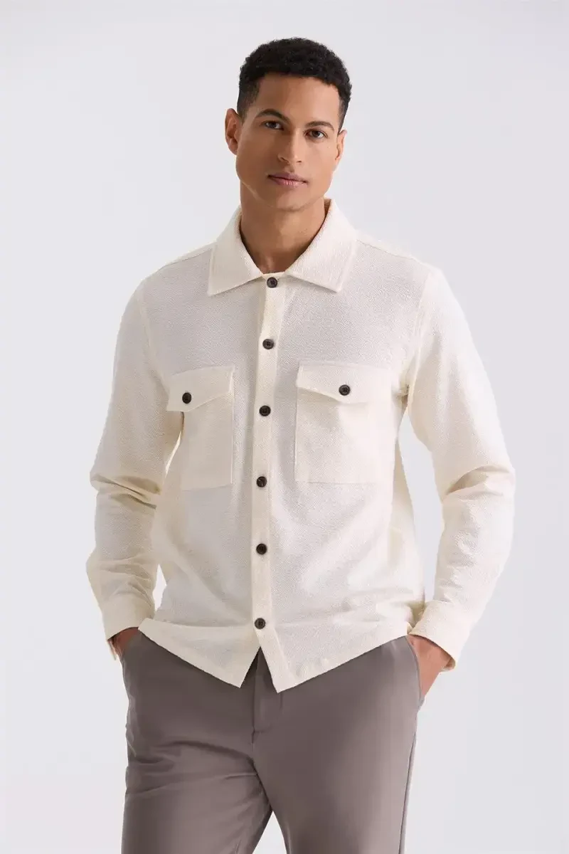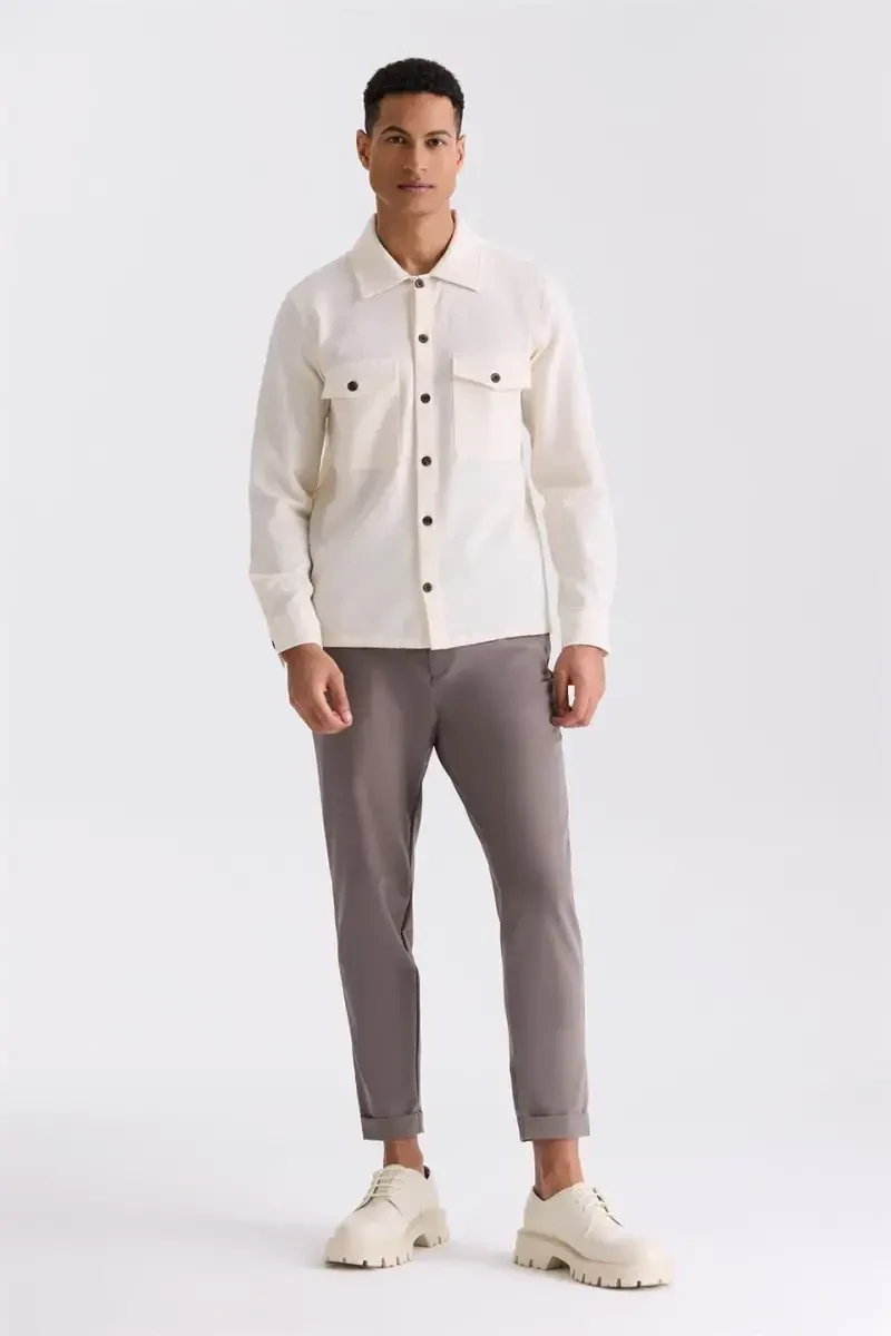 Krem Slim Fit Erkek Gömlek | Düğmeli Yaka, Cepli Model | Şık ve Rahat