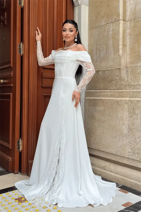 Krep Kumaş Balen Dantel Detaylı Abiye Elbise - BEYAZ