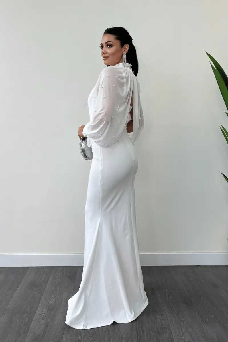 На модели 36 размер. Состав ткани изделия: 100% полиэстер. Рекомендуется химчистка. Полная длина изделия: 160 см (возможны отклонения в измерениях на 1-3 см). Длина болеро: 40 см. Жемчужные детали тщательно пришиты вручную. БЕЛЫЙ цвет изделия может незначительно отличаться в зависимости от условий освещения.