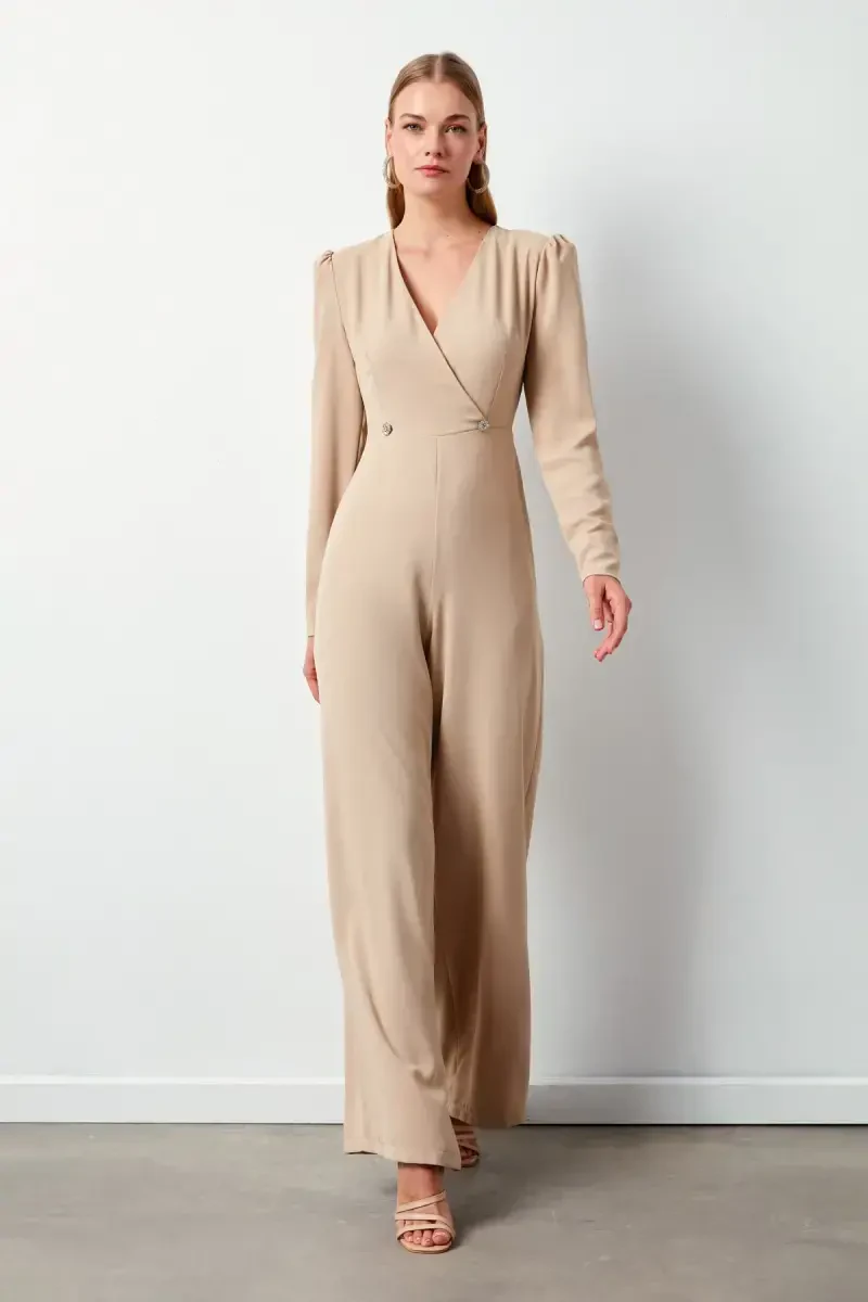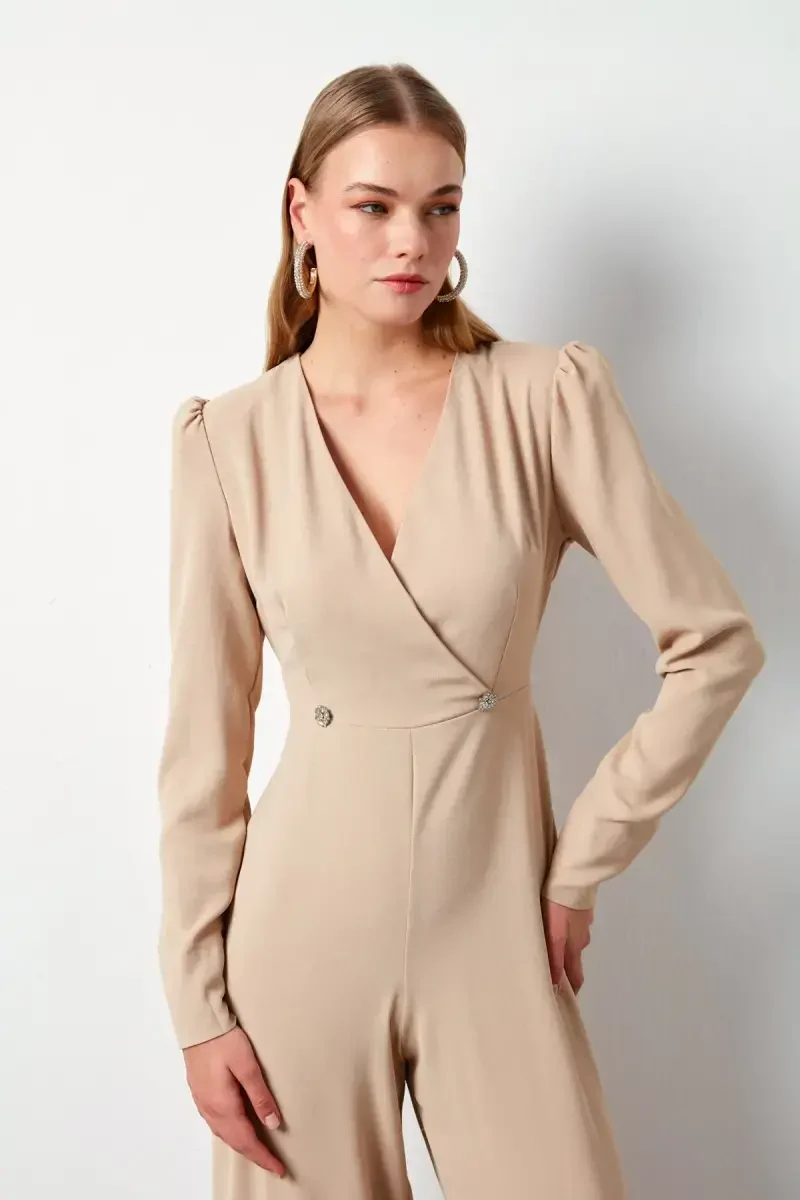 Креповый комбинезон с запахом и декоративными камнями - бежевый - это особый дизайн, сочетающий в себе элегантность и комфорт. Этот комбинезон станет одной из незаменимых вещей в вашем гардеробе. V-образный вырез подчеркивает элегантный вид комбинезона, а детали из камней добавляют ему блеска. Широкий крой штанин обеспечивает свободу движений и создает современный и модный силуэт. Креповая ткань комбинезона сохраняет свой элегантный вид и обеспечивает комфорт в течение всего дня. Подплечники поддерживают вашу осанку, помогая вам выглядеть более уверенно и уверенно в себе. Застежка-молния сзади позволяет легко надевать и снимать комбинезон, а рукава на молнии предлагают различные варианты стиля. Этот комбинезон идеально подходит для особых случаев, элегантных ужинов или повседневного использования и позволит вам выделиться в любой обстановке. Благодаря идеальному крою он идеально сидит по фигуре и искусно скрывает недостатки. Комбинезон длиной 159 см обеспечивает идеальные пропорции и становится еще более привлекательным в сочетании с туфлями на каблуке. На модели изделие размера 36/S, параметры модели: рост: 1,76, грудь: 84, талия: 60, бедра: 90. Эта информация поможет вам при выборе размера. Креповый комбинезон с запахом и декоративными камнями предлагается вам под гарантией Sateen. Этот комбинезон станет любимой вещью в вашем гардеробе и станет идеальным выбором для женщин, которые ищут элегантность и комфорт в одном.