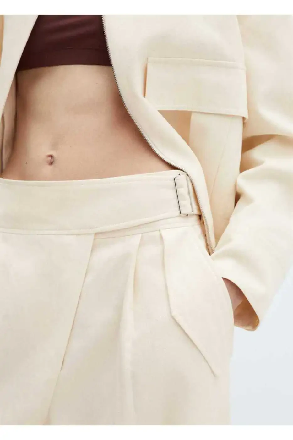 kruvaze pensli pantolon, keten ve pamuk karışımlı pantolon, normal bel, gizli fermuar, ayarlanabilir kemer, pili detaylı pantolon