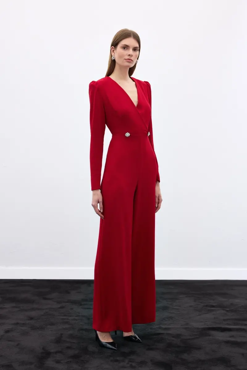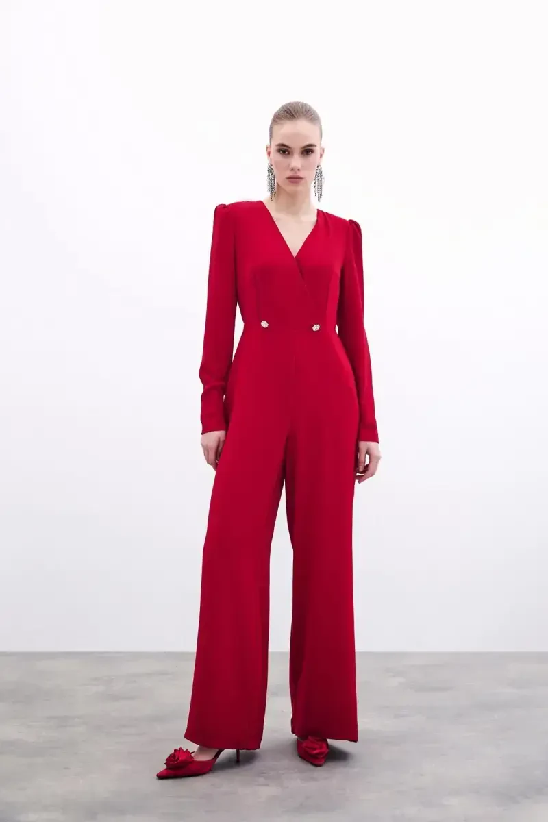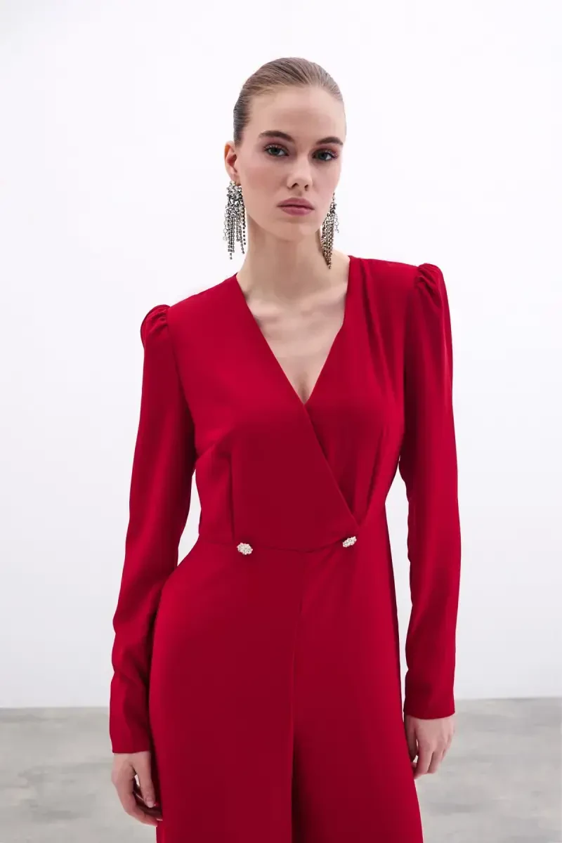 Kruvaze tulum, krep tulum, qizil tulum, bezak toshli tulum, ayollar tulum, chiroyli tulum, maxsus tadbir, kundalik foydalanish, kruvaze yoqa, krep mato