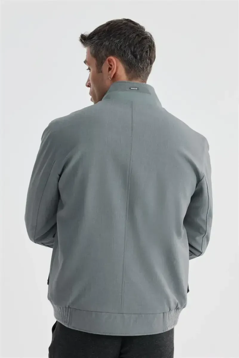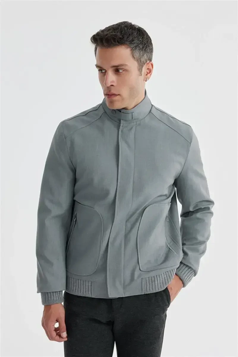 Grey casual mont, tik turgan yoqali mont, comfort fit mont, zamonaviy mont, qulay mont