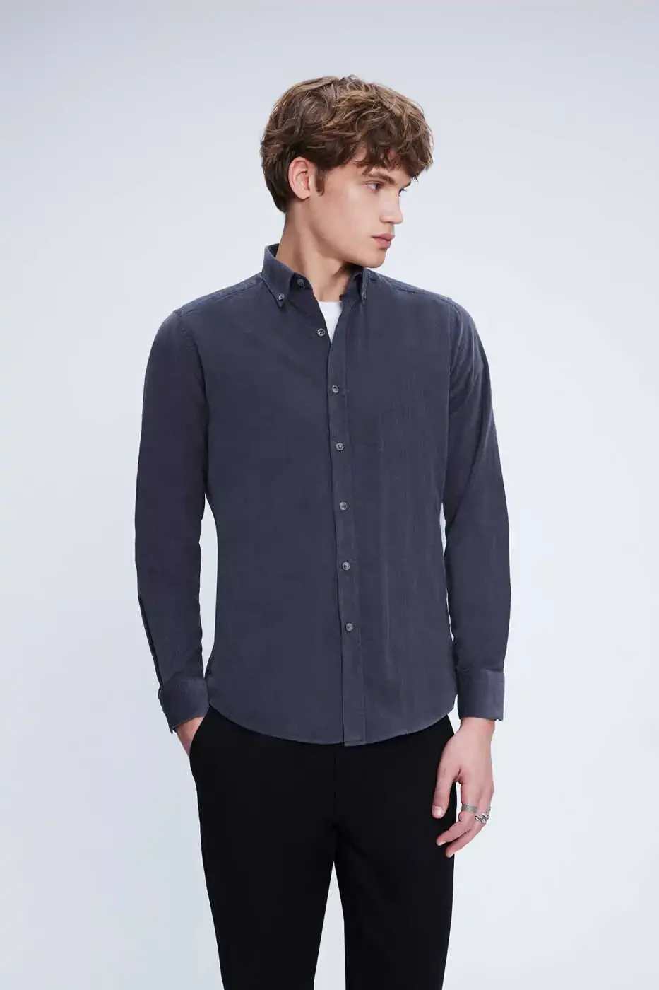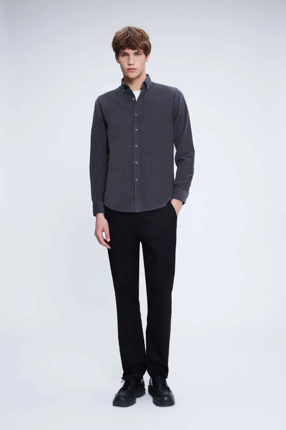 Kulrang ko'ylak, slim fit ko'ylak, paxta ko'ylak, tugmali yoqa, uzun yengli ko'ylak, erkaklar ko'ylagi, zamonaviy ko'ylak, chiroyli ko'ylak, qulay ko'ylak, paxta erkaklar ko'ylagi