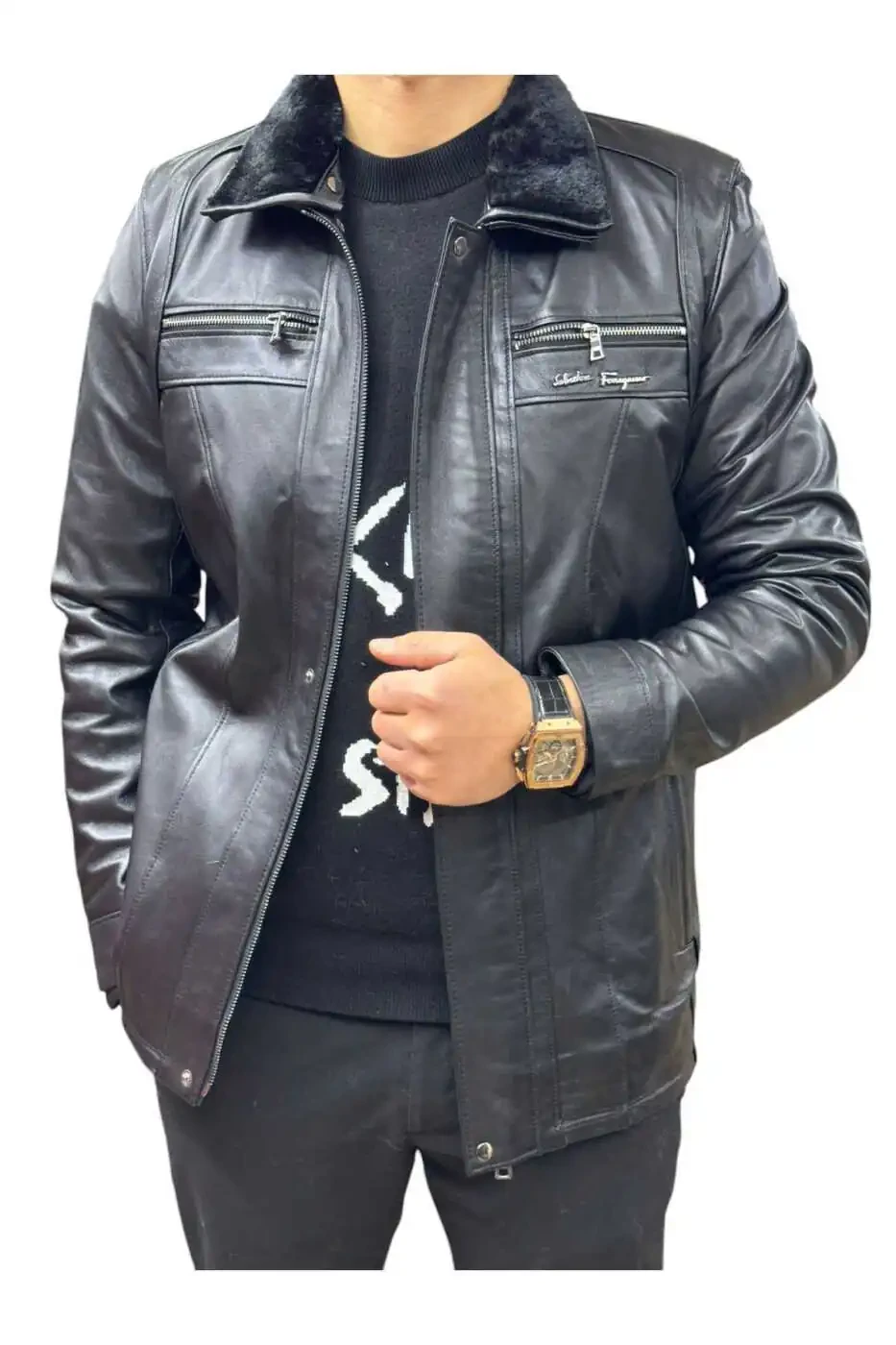 The men's fur-collar zipper leather jacket is a design where style and warmth meet. Features include: