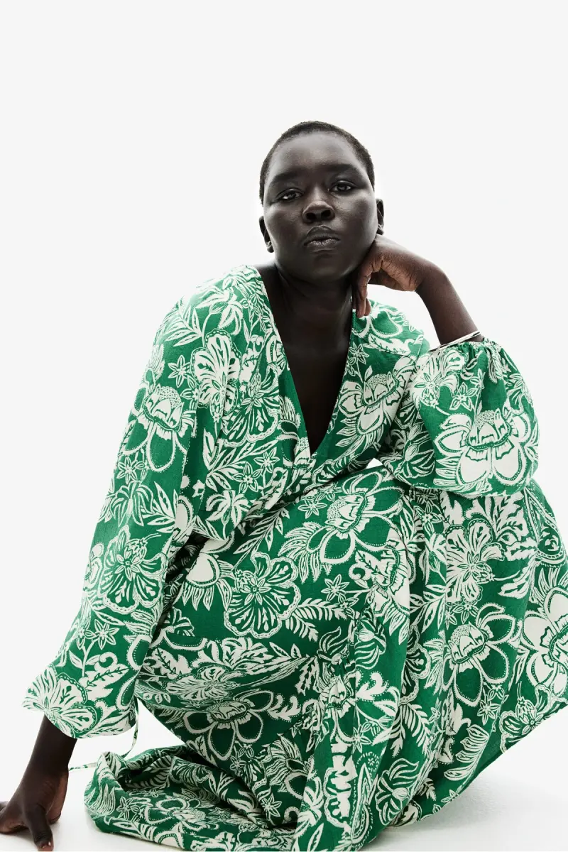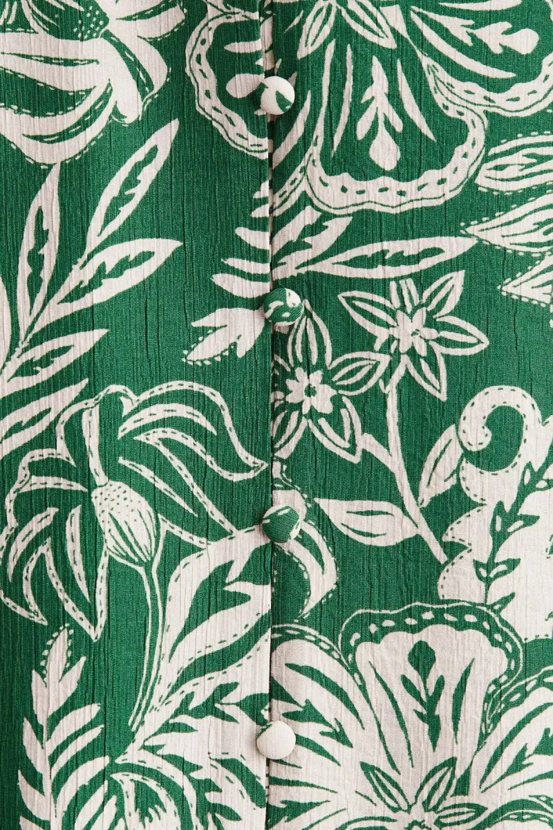 Kuşaklı Krep Elbise-Yeşil/Desenli