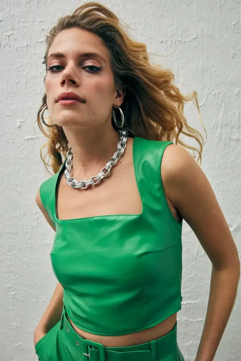 teri crop bluzka, kvadrat yaka bluzka, yashil bluzka, ayollar uchun bluzka, crop top, teri tashqi kiyim, zamonaviy bluzka, uslub