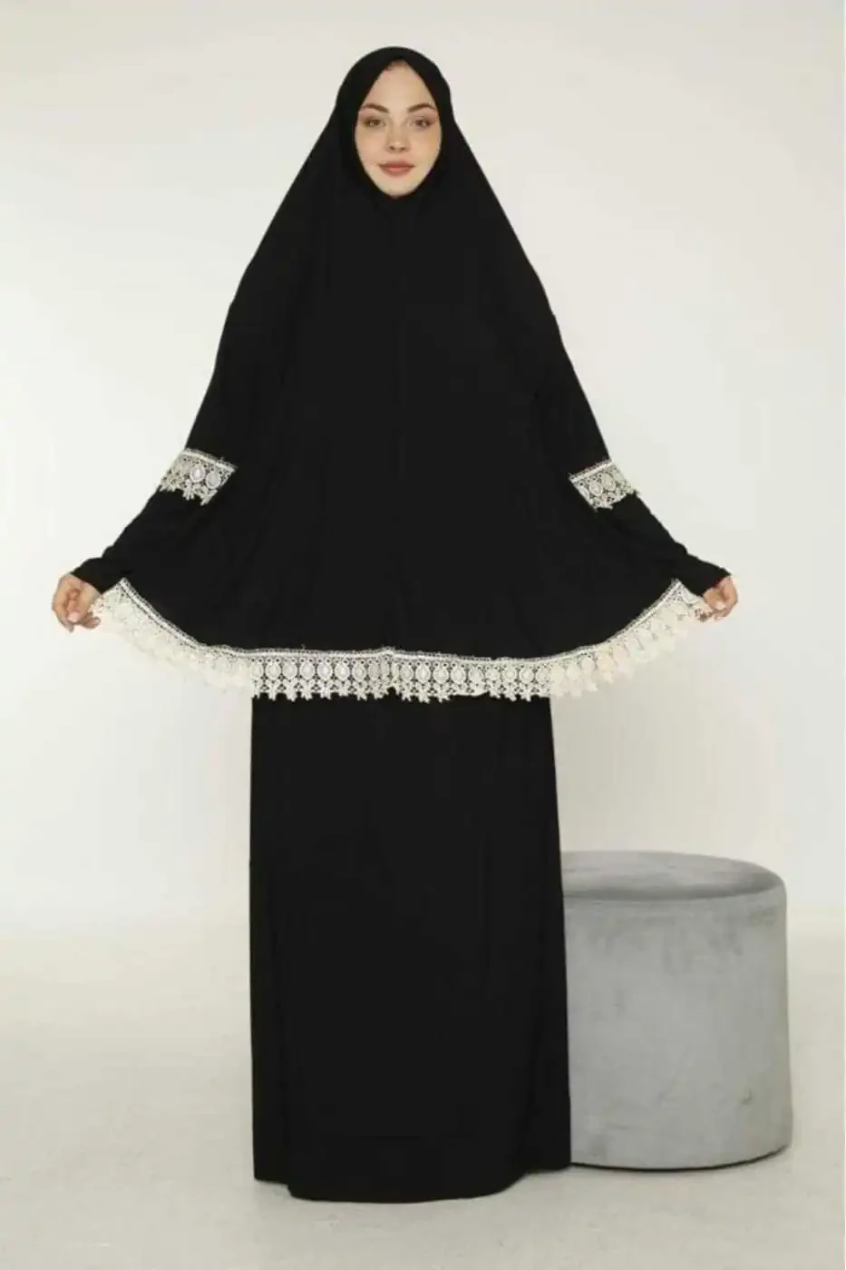 Adorn yourself with grace and elegance during your sacred pilgrimage with our exquisite Ihram and Prayer Outfit, adorned with delicate guipure lace detailing.